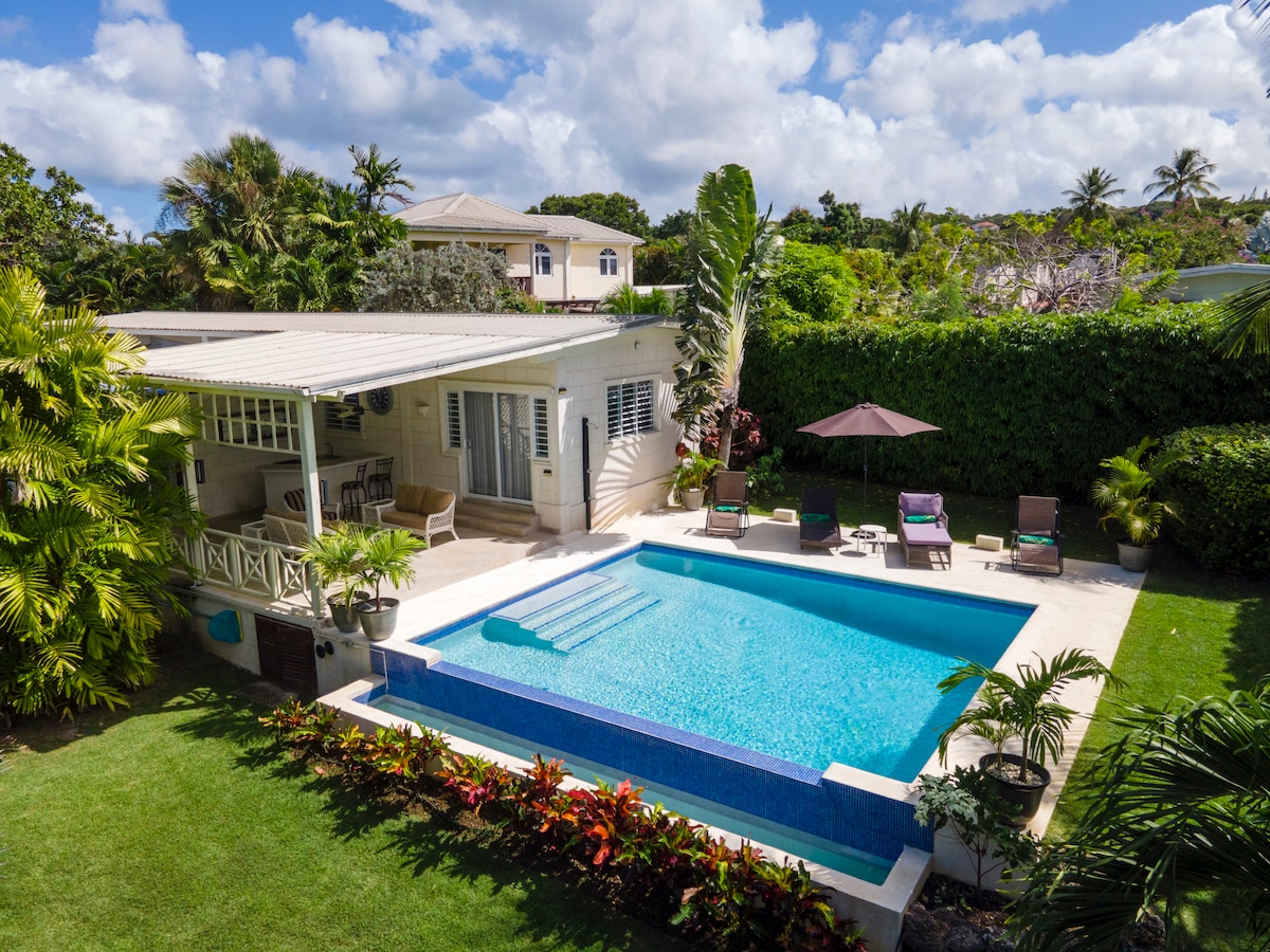A beautiful villa in a quiet cul-de-sac close to Holetown. The house has four spacious en-suite bedrooms and an en-suite media/TV room. The fully equipped kitchen has granite counter tops and is attached to the laundry. The entry foyer leads to the beautiful livingroom. Adjacent is a open plan outdoor dining and living space, which leads to the pool deck with gazebo seating and a plunge pool. There is also a bar for entertaining from inside or by the pool deck.