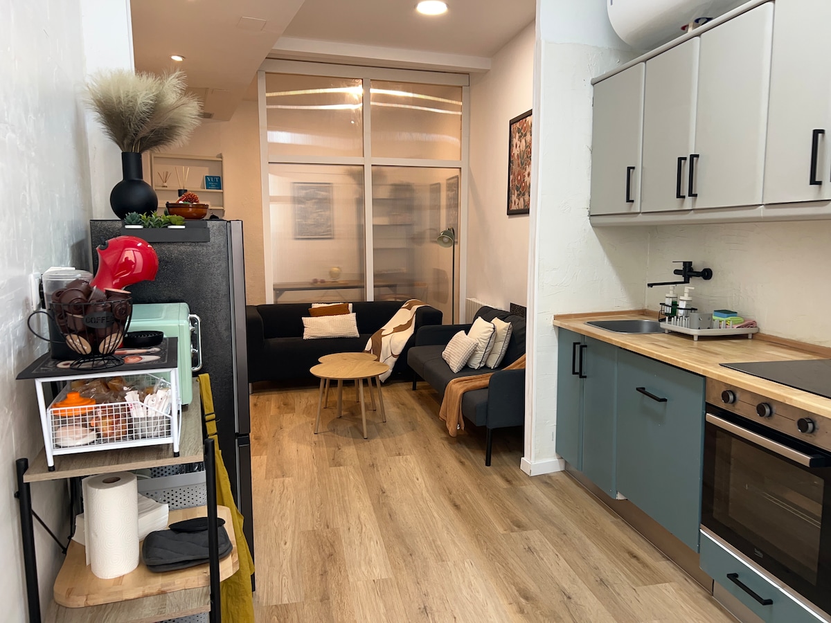 Kleine komplette Wohnung im Dorf 45 km von Saragossa entfernt. Ideal für zwei Personen. Sehr hell, Schlafzimmer mit Doppelbett, Balkon und Bad mit Dusche im Inneren. Wohnzimmer mit offener Küche und eine möblierte Terrasse. Klimaanlage und Heizung. WLAN. Wohnung mit separatem Eingang. Ein Schlafzimmer. Platz für vier Personen. Zwei Schlafplätze auf dem Schlafsofa. Es liegt am Eingang des Dorfes und neben dem Gemüsegarten mit einem schönen Spaziergang, um die Natur und die Ruhe zu genießen