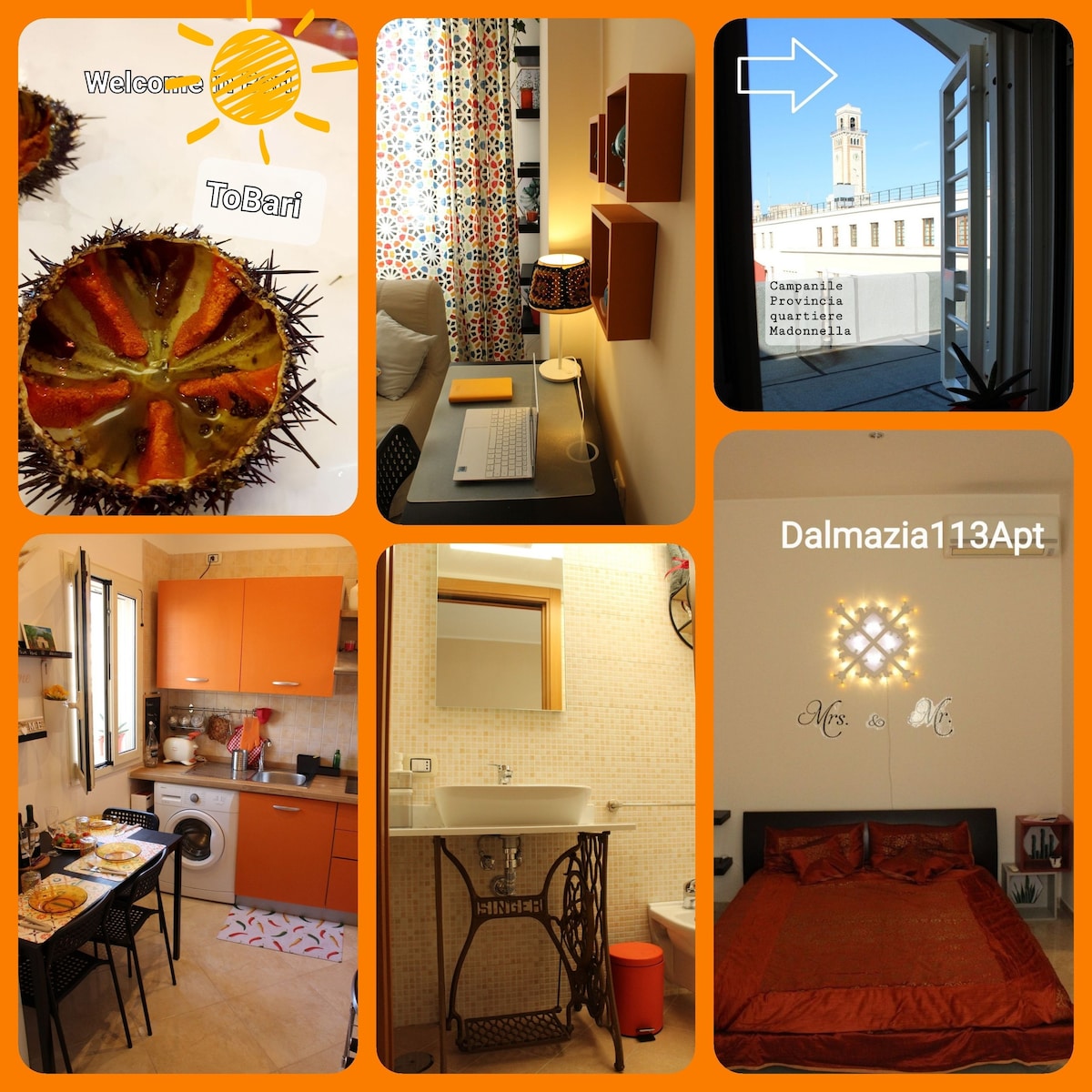 Das Hotel liegt im Zentrum von Bari und ist ideal, um die schönsten Orte der Stadt zu erreichen; es verfügt über eine Terrasse mit Meerblick, von der aus Sie in 62,5 m Höhe einen der meistfotografierten Türme von Bari sehen können: den Uhrenturm des Palazzo della Provincia. Sie befindet sich im 5. Stock ohne Aufzug eines ruhigen und herrschaftlichen Gebäudes mit typischen Treppen. Es ist 14 Minuten zu Fuß zum Hauptbahnhof und 25 Minuten mit dem Auto zum internationalen Flughafen Karol Wojtyla. Ich hoffe, Sie fühlen sich auch ein wenig wie zu Hause.