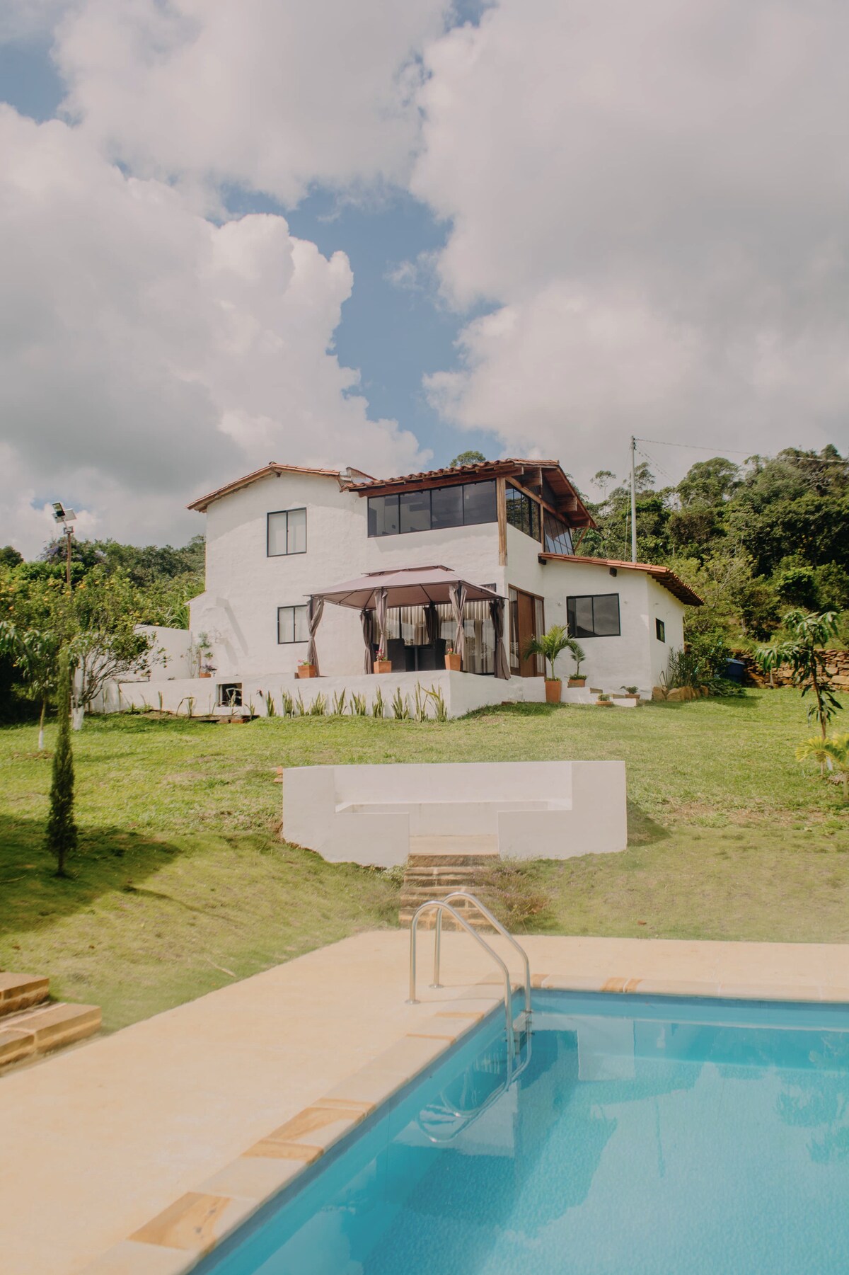 Finca de ensueño a 2 km del pueblo mas lindo de Colombia. Cuenta con piscina, zona bbq, capilla privada, mesa de ping pong, mesa de billar, estar de lectura y amplias zonas verdes para caminar. Las primeras 4 habitaciones cuentan con televisor y baño privado y la quinta es ideal para grupos grandes (tiene sus respectivos baños en la zona comunal). La Villa es el escenario perfecto para reunirse con la familia o los amigos y es ideal para eventos y matrimonios por su belleza y amplias plazoletas.