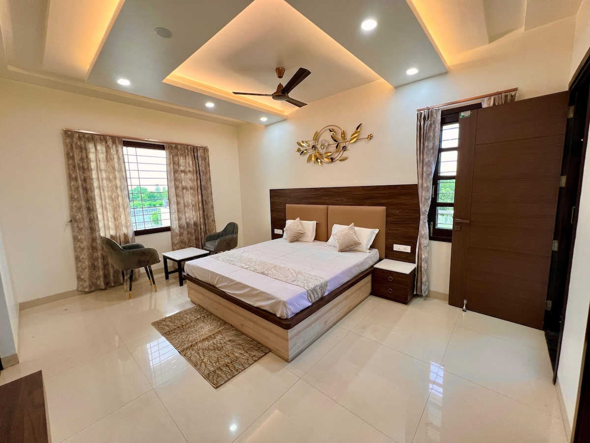 Relax with the whole family at this peaceful place to stay. We have 1 private bedroom with attached bathroom and one private living room for made sitting area and dinning area. Free Wi-Fi, AC inside bedroom, Power back and free parking available at property. Taxy car food all the things will be arranged at our end if you need of it. Base occupany is 2 guest and 5 guest comfortably can stay at property with extra bedding and matress . Very safe and homely environment we want to provide our guest.