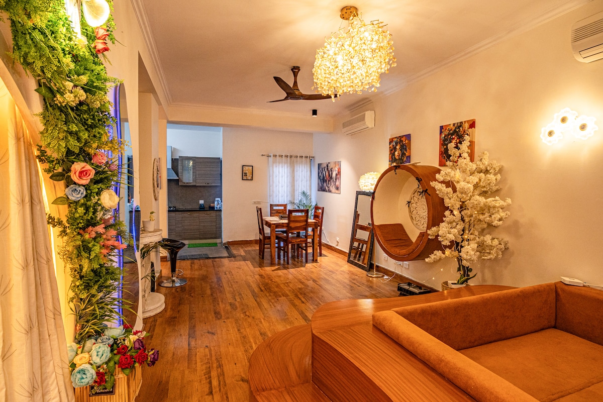 Indiens erste Privatunterkunft mit dem Thema „FRIENDS“!! Eine Nachbildung von Monicas Wohnung aus der legendären TV-Serie. Denke an Monicas Küche, das lila Wohnzimmer, den ikonischen gelben Rahmen, das Schlafzimmer mit dem russischen Gemälde, einen Tischfußballtisch und eine ganze Menge Nostalgie! TOTAL INSTA-WÜRDIG Die gleiche ikonische Friends-Wohnung, mit Vintage-Flair, gemütlichen Ecken und lebhaften violetten Akzenten. Tritt ein auf die Terrasse mit griechischem Motto mit Blick auf den üppigen Golfplatz mit einem Whirlpool auf der Dachterrasse (750 Rs extra).