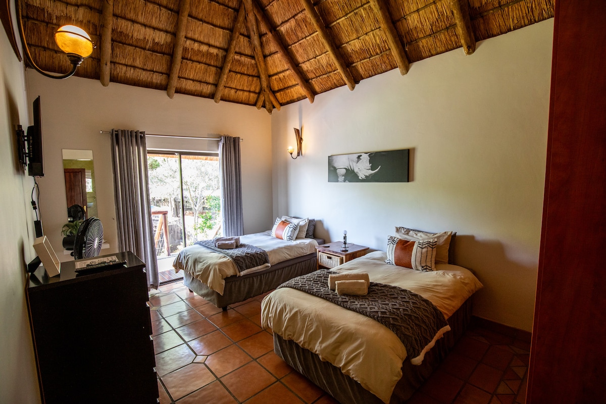 Unser exklusives Zimmer bietet 2 Einzelbetten oder ein Kingsize-Bett mit eigenem Bad, TV, Klimaanlage, einer privaten Terrasse, Kaffee- und Teezubehör, einem Kühlschrank, Schreibtischen, einem privaten Braai-Bereich, Handtüchern und Safes.