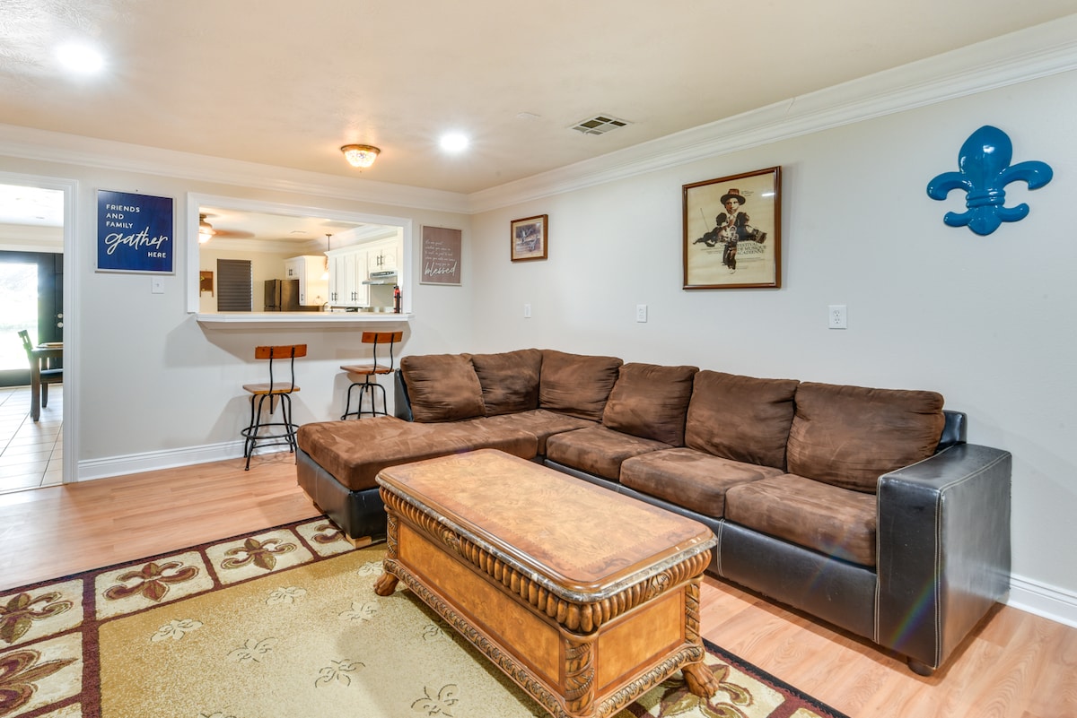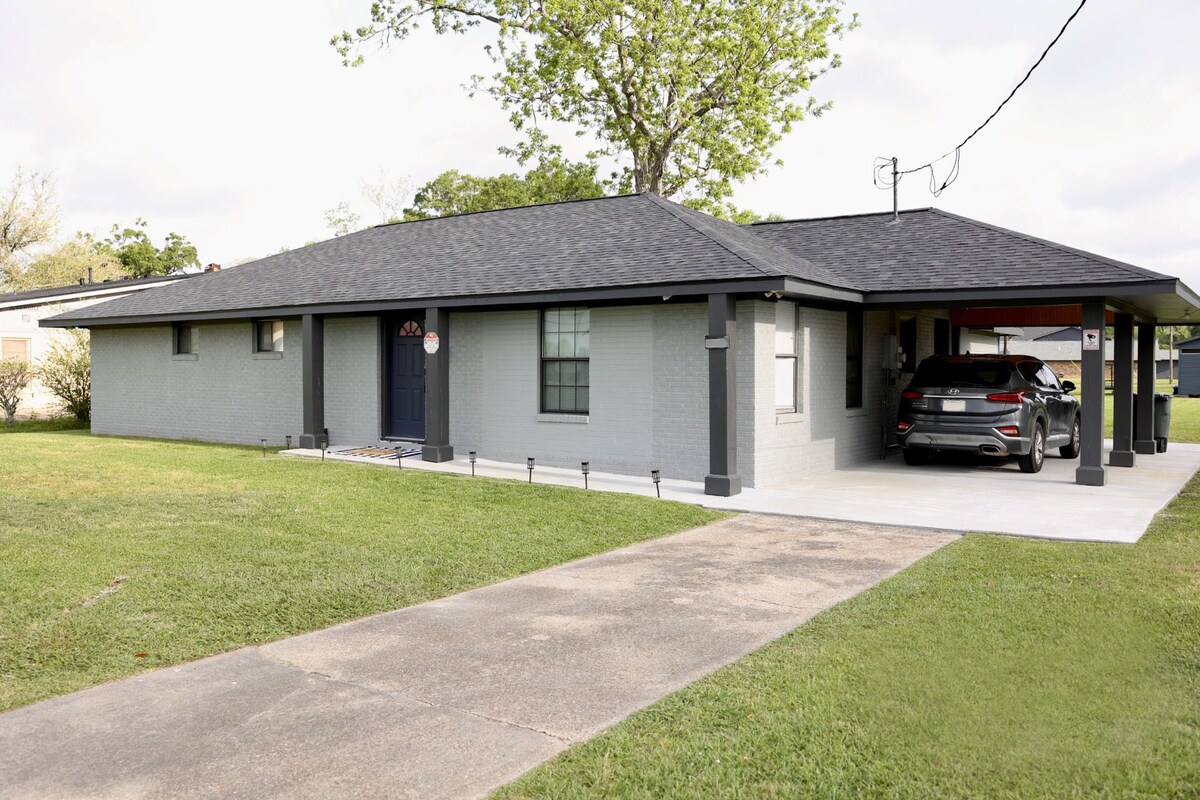 Make yourself at home with this newly built family-friendly 3 bedroom Lake Charles Retreat. This welcoming home features 2 queen, 2 twin bed, an air mattress and 2 bathroom. Located just 3 miles from restaurants, fine dining, shopping, entertainment, live music and casinos. Guest can enjoy a comfortable open living room with an infinity table for the family to play games. Amenities are WiFi, AC, iron, and washing machines. No parties, no events, no smoking or vaping inside.