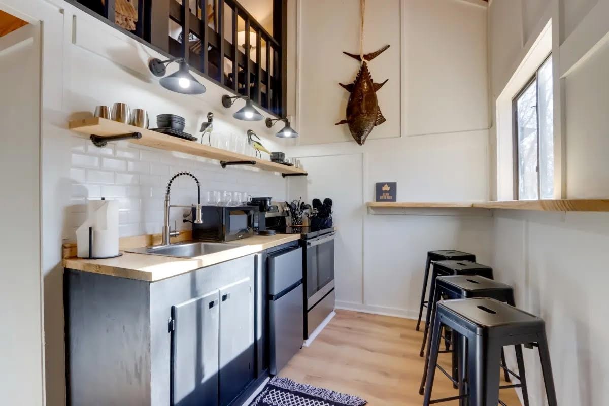 Welcome to Pedal and Perch, a custom-designed and built accessory dwelling cabin just minutes from downtown Bentonville, AR, Walmart HQ, and miles of incredible mountain biking. Enjoy a serene setting that tucks you among the trees and makes you feel like you are staying in your own treehouse. The cabin features a custom kitchen, one bathroom, a queen bed in the loft, a pullout sofa on the primary floor, and your very own outdoor bathtub looking in to the valley below.