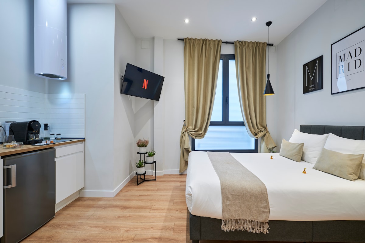 Elegante y confortable estudio de alquiler por días situado en el corazón de Madrid ideal para parejas y singles. Su estilo escandinavo desborda calidad y belleza. Situado en pleno Barrio de Las Letras, podrás visitar caminando los principales puntos de interés turístico del centro histórico de Madrid. A 2 minutos andando de la Puerta del Sol y a pocos pasos de la Plaza Mayor, Palacio de Oriente... Es una 2ª planta con ascensor y exterior Estación de Metro cercana: Sol.