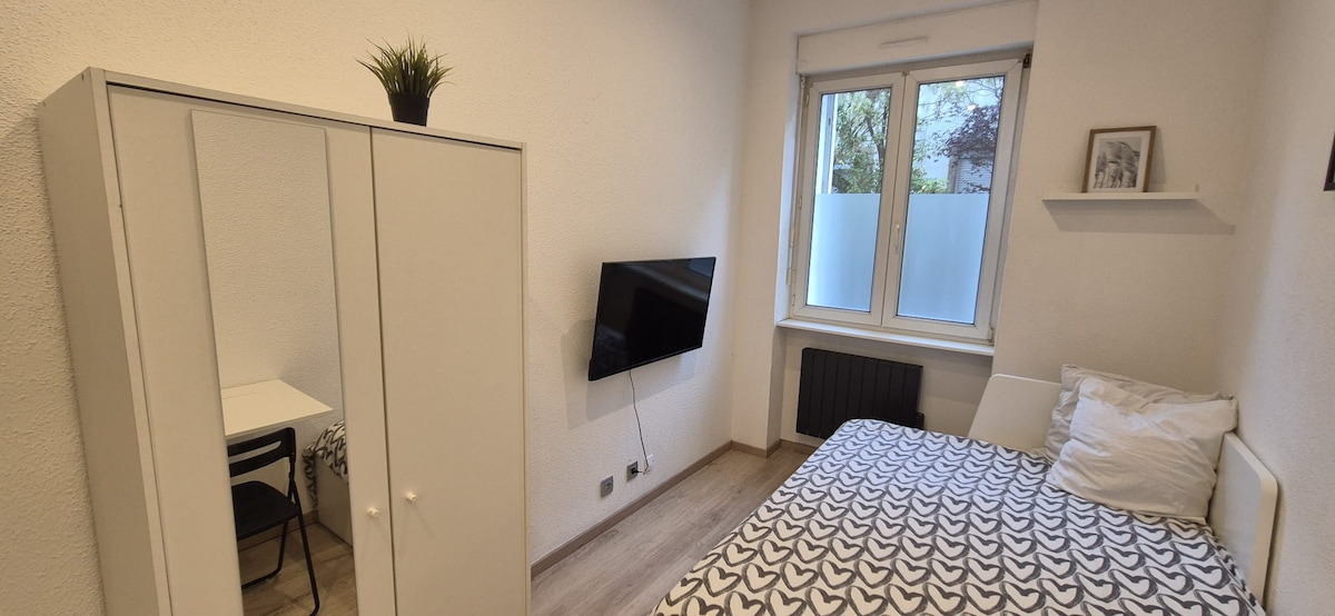 Kleines gemütliches und renoviertes Appt, Zentrum von Mulhouse, in der Nähe von Annehmlichkeiten (Geschäfte, historisches Zentrum und Markt 500 m entfernt). Schlafzimmer mit Bett 160x200, Wohnbereich mit Einbauküche und Schlafsofa 150x200, Bad mit Badewanne. Voll ausgestattet: - Wäsche (Bettwäsche, Handtücher) - Grundnahrungsmittel (Kaffee, Tee, Wäsche, Toilettenpapier...).