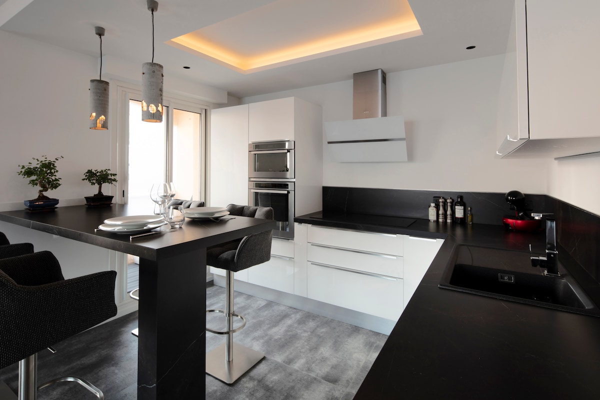 Luxuriöse, sehr ruhige Wohnung mit atemberaubendem Panoramablick auf das Meer und einen privaten Parkplatz in der Residenz im Freien. Eine Oase der Ruhe, 5 Autominuten von Monaco, 12 Gehminuten vom Strand Golf Bleu und vom Bahnhof entfernt. Sehr hell mit großen Fenstern, Balkonen, voll ausgestatteter amerikanischer Küche, Highspeed-Internet-WLAN, großem TV-Bildschirm im Wohnzimmer und Schlafzimmer, moderne ebenerdige Dusche, Klimaanlage.