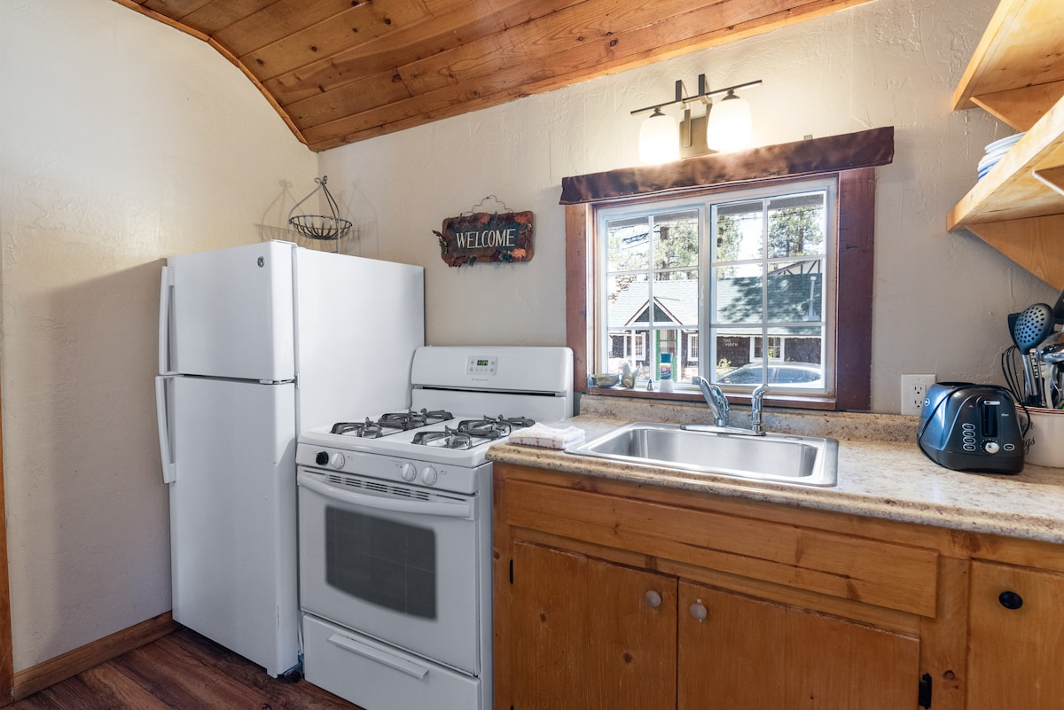 Studio mit privater Grillterrasse, Badezimmer und Küchenzeile. Heißluftfritteuse, Mikrowelle, Toaster, Grill, Geschirr, Wasserkocher und Kaffee/Bar. Gegen Aufpreis steht ein Geschirrspülservice zur Verfügung – perfekt, wenn Sie kochen, grillen oder Essen zum Mitnehmen bestellen. Privater Eingang, getrennt durch einen Abstellraum, ein ruhiger Puffer zwischen dir und dem anderen Mieter. Parkplatz. Ideal, um dem Lärm zu entkommen, wieder in Verbindung zu treten und die Big Bear Stadtrandgebiete zu erleben. 15-20 Minuten malerische Fahrt zu Geschäften und Restaurants. Direkt neben dem PCT gelegen