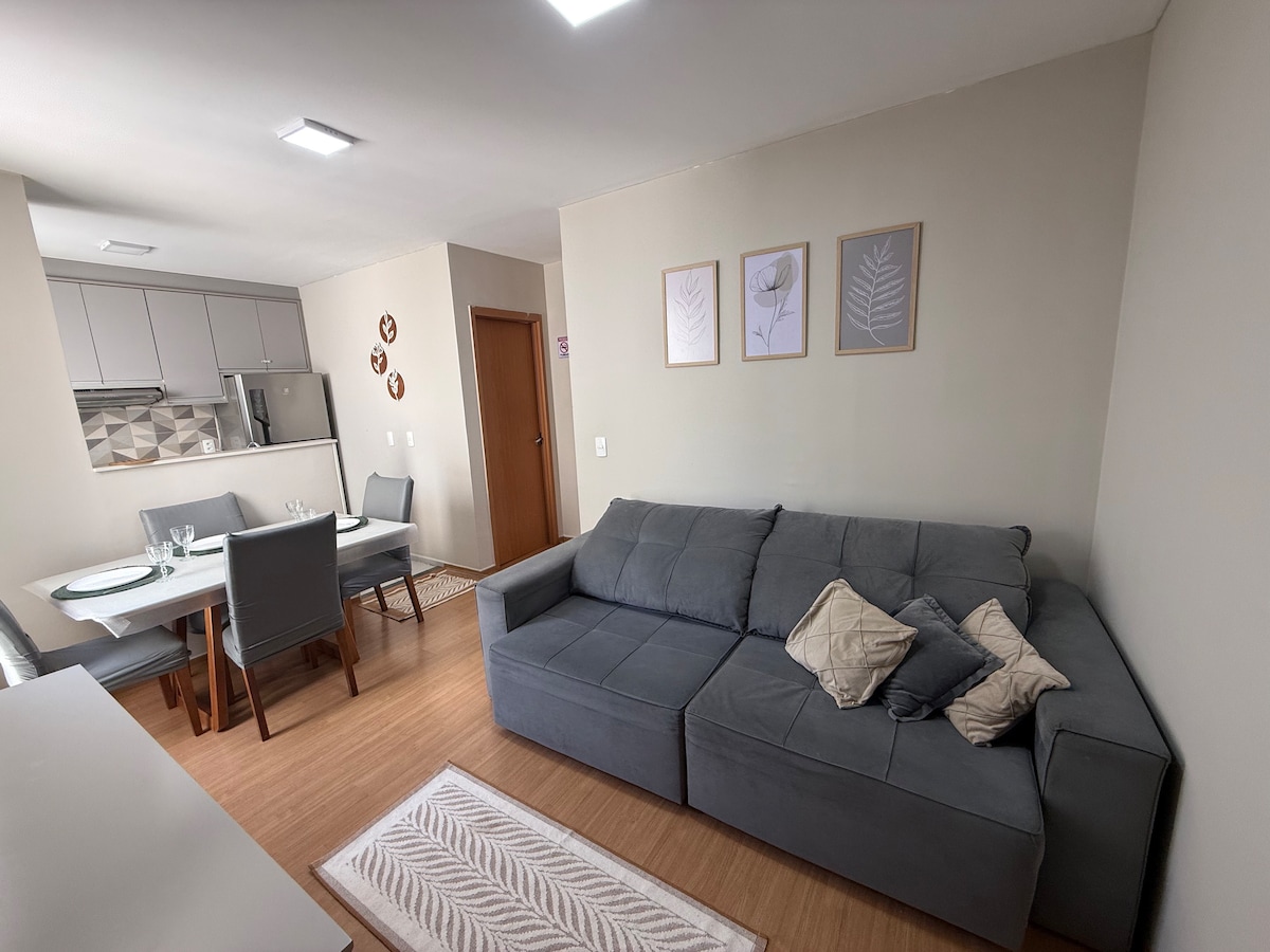 Neue, saubere und gemütliche Wohnung Voll ausgestattete Küche, Heißluftfritteuse, Sandwichmaker Wäscherei mit Tank Bügeleisen und Föhn Fernsehzimmer, Netflix, Globo Play, Sofa 2 Schlafzimmer – 1 Suite mit Dusche, Queensize-Bett, 100 % Verdunkelungsvorhang Zimmer 2 mit einem Doppelbett (Standardgröße), Verdunkelung 100 % Soziales Badezimmer mit Dusche Balkon, Grill und Waschbecken Private überdachte Garage in der Wohnanlage In der Nähe: Supermarkt, Apotheke, Restaurants und Einkaufszentrum WIR HABEN WLAN WIR AKZEPTIEREN KEIN HAUSTIER