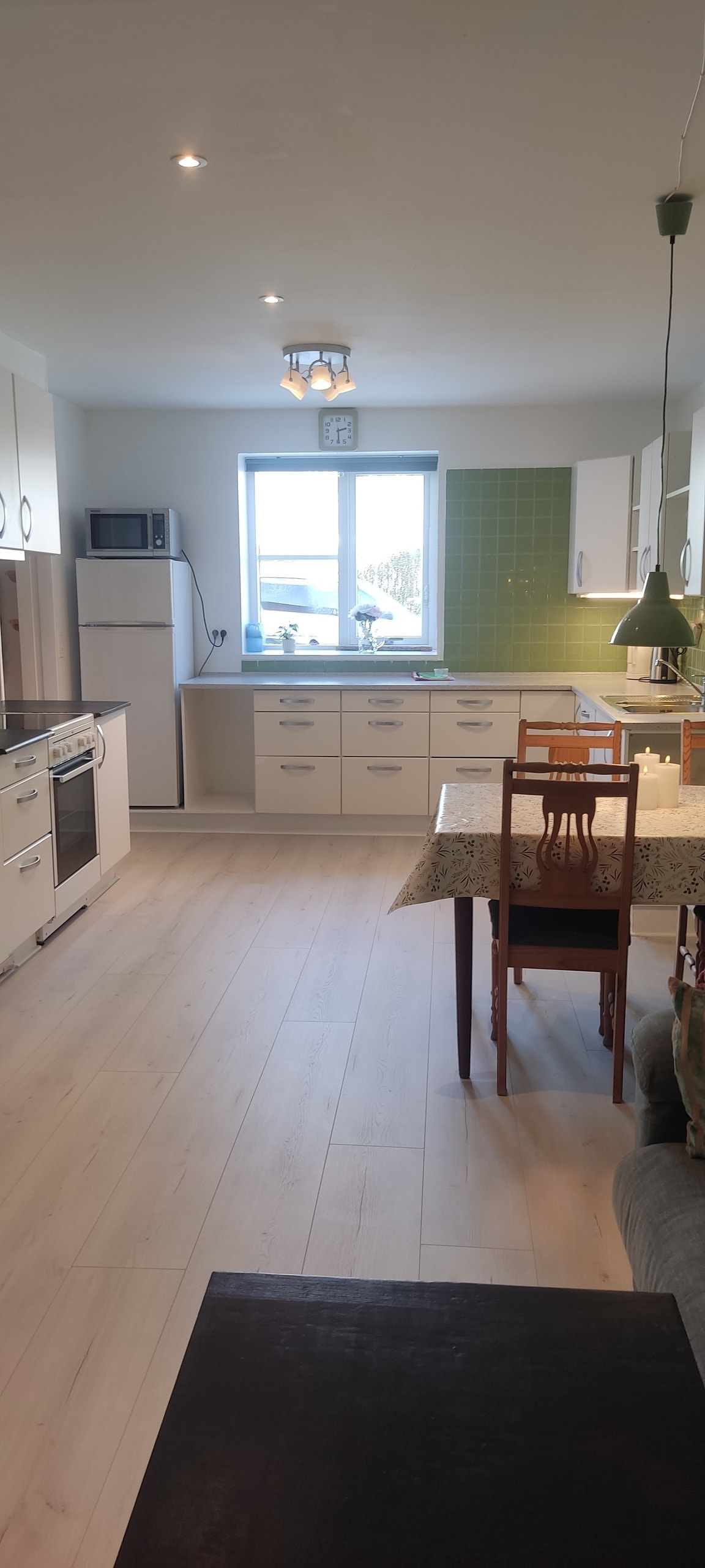 Gut ausgestattete Wohnung für die Familie unterwegs. Parkplatz direkt vor der Tür Die Wohnung ist 60 qm groß und besteht aus Eingangshalle, großer, gut ausgestatteter Küche, Sofaecke in offener Verbindung mit Küche, wo es auch einen Essbereich gibt. Es gibt einen TV mit DVD und Chromecast. In der Ecke des Eingangs für die 5. Übernachtung wurde eine Nische eingerichtet, die geschlossen werden kann, und es gibt einen Kleiderschrank. Ein Schlafzimmer mit einem Doppelbett und einem Stockbett und einem Kleiderschrank. Kleinerer Verteilerflur. Badezimmer mit Dusche und Waschmaschine.