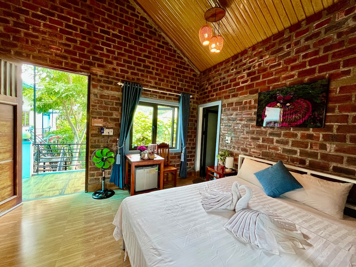 Willkommen in unserem Gäste-Favoriten-Zimmer! Unser gemütliches Doppelzimmer mit atemberaubendem Bergblick ist eine Top-Wahl unter den Gästen. Mit seiner warmen Atmosphäre, dem komfortablen Bett und dem privaten Badezimmer ist es ideal für Paare oder Alleinreisende, die sowohl Komfort als auch Charme suchen. Die großen Fenster bringen viel natürliches Licht herein und machen es zu einem perfekten Ort, um mit der Schönheit von Phong Nha direkt vor der Tür aufzuwachen. Entspanne dich am Pool oder genieße einfach die ruhige Gartenanlage, nachdem du Höhlen und Reisfelder erkundet hast.