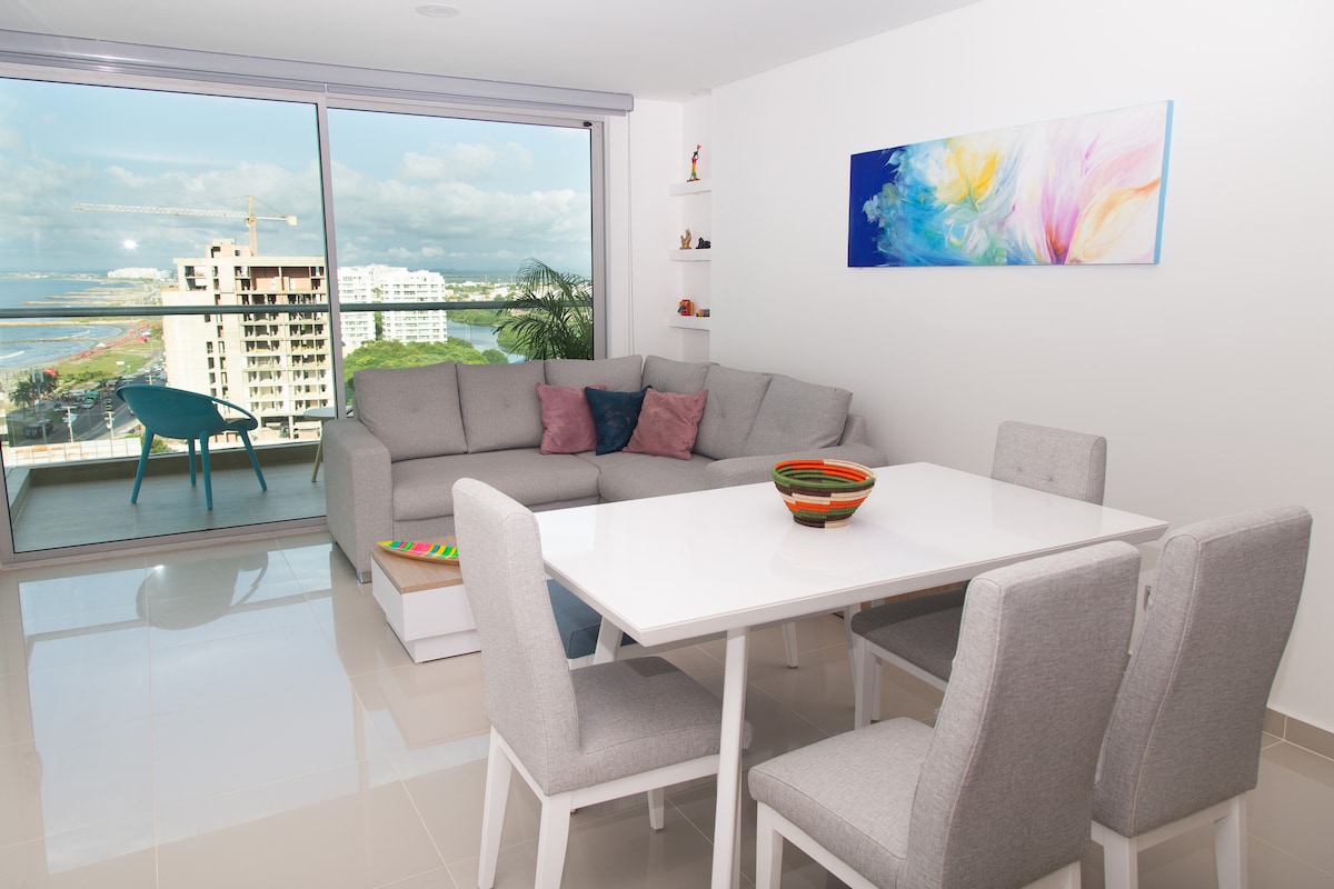 One bedroom apartment with an amazing view on the 20th floor. Located less than 10 min. away (by taxi) from the Old City, and around the building you can find tons of places to eat or drink anything you want… It's your perfect hub for your next visit to Cartagena! The building has a 24/7 concierge and an outdoor swimming pool (as well as another one for kids) as well as sauna, jacuzzi and gym. Please keep in mind that only registered guests are allowed to access the building.