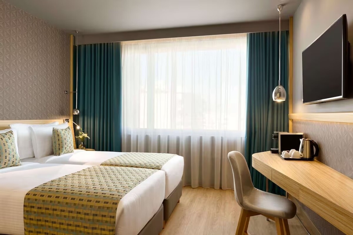 Ein helles, komfortables Zimmer mit einem sauberen, modernen Design und sanften, neutralen Tönen, das einen gemütlichen Aufenthalt im Herzen von Athen bietet. Genieße ein bequemes Doppelbett, Holzböden, ein modernes Badezimmer mit Dusche, Klimaanlage, kostenloses WLAN und einen Kühlschrank für deine wichtigsten Dinge. Große Fenster umrahmen den Blick auf die Stadt und füllen den Raum mit Tageslicht. Beginne deinen Tag mit kostenlosem Kaffee in der Lobby und beende ihn auf der Dachterrasse mit Panoramablick und einem entspannenden Whirlpool.