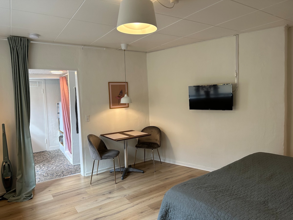 Ferienzimmer im Hinterhaus mit eigenem Eingang und Badezimmer. In der Nähe von Bus, Einkaufsmöglichkeiten und Hafen. Großes Zimmer mit Doppelbett und Essbereich für 2 Erwachsene. Kombinierter Eingang, Dusche und Küchenzeile mit Mikrowelle, Wasserkocher, Toaster und Kühlschrank. Abendessen für 2 Personen. Gasgrill und privater Essbereich im Freien für 2 Personen RAUCHEN AUF MATRIKEL. Hypoallergenes Zuhause - keine Tiere. Bettwäsche, Handtücher parfümfrei gewaschen. Preis inkl. Bettwäsche/obligatorische Reinigung. Overbo geht durch den Innenhof, um zu seiner Wohnung zu gelangen