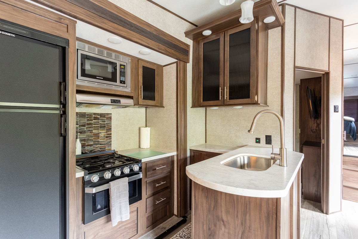 Perfekt für einen Kurzurlaub! Hell, warm und gemütlich, neues 5. Rad für vier Jahreszeiten in den Bergen. Dieser Raum befindet sich in einer privaten Lage und verfügt über eine voll ausgestattete Küche, eine Außenküche mit Bar, ein Badezimmer mit Dusche, einen Propangasherd, 40-Zoll-Fernseher, Netflix, WLAN, einen elektrischen Kamin, einen überdachten Carport und eine große Terrasse. Du findest auch einen maßgefertigten holzbeheizten Whirlpool nur wenige Schritte von der Tür entfernt. Die Innenstadt von Nelson liegt nur 5 Fahrminuten und das Skigebiet Whitewater nur 20 Fahrminuten entfernt.