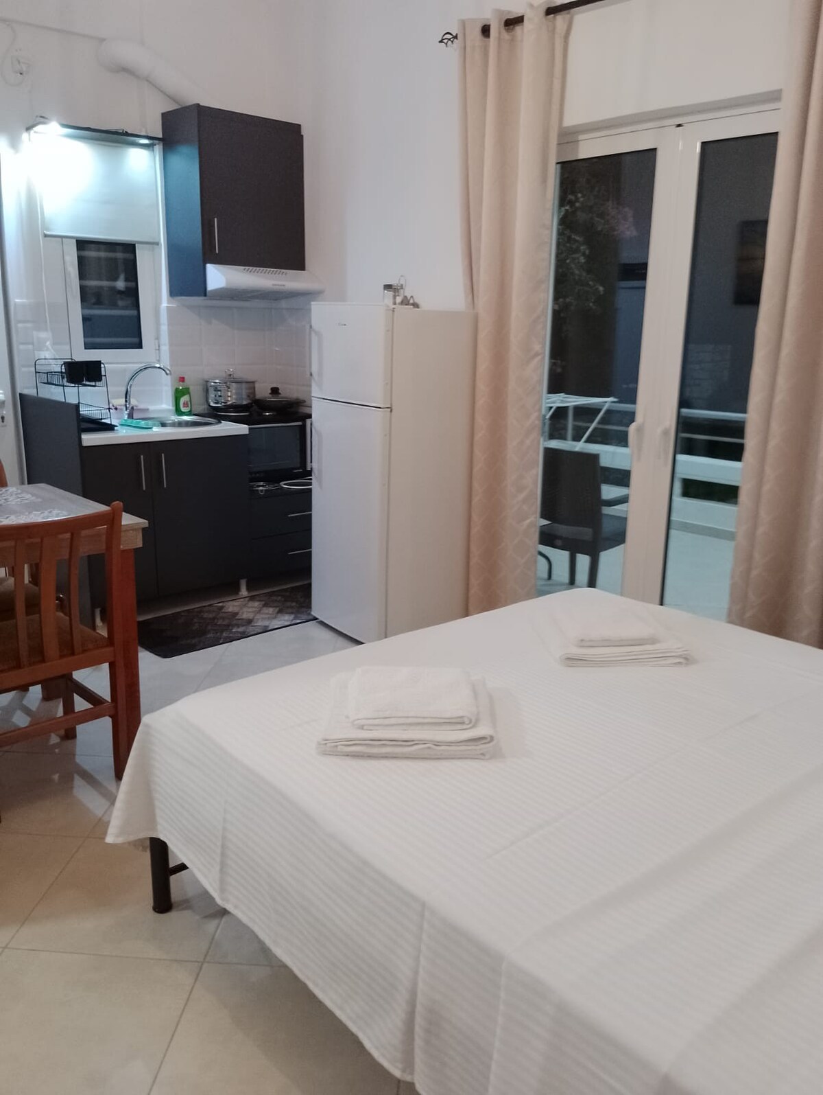 Newly, completely renovated 1st floor studio in the heart of Kalamata, in the immediate vicinity of the Central Square and International Dance Center. It has 1 king size bed and a fully equipped kitchen. Modern, well-furnished and fully functional. It is suitable for couples, families with infants, professionals or anyone else who desires relaxation and tranquility.