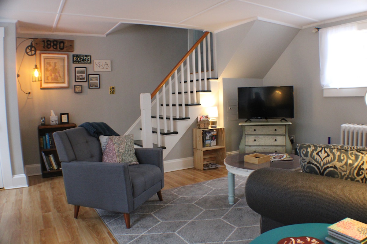 Lehne dich zurück und entspanne dich in diesem stilvollen Studio! Unser Haus befindet sich in einer ruhigen Gegend mit älteren Häusern, umgeben von Wäldern und dennoch günstig in der Innenstadt, eine halbe Meile von unserem Dorfgrün (Milford Oval) entfernt. Ein kurzer Spaziergang über den Fluss führt dich zu Cafés, Restaurants, Pubs mit Live-Musik, Post, Bibliothek, Geschäften und nützlichen Geschäften wie CVS. Was auch immer dich bringt … Geschäft, Skifahren, Wandern, Antiquitäten, eine Familienfeier oder ein romantisches Wochenende … wir freuen uns darauf, dich bei uns zu begrüßen!