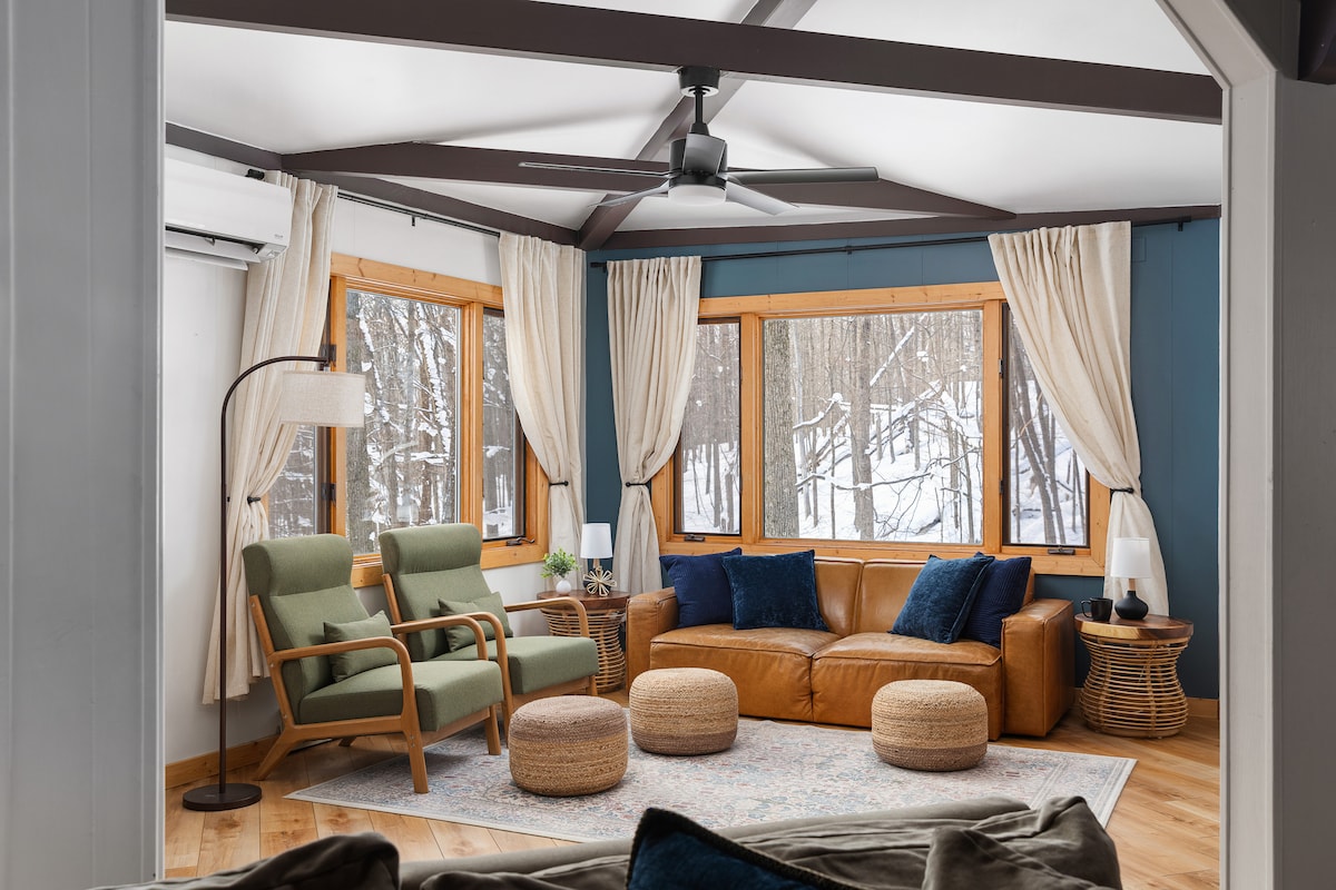 Genieße die moderne Austur-Hütte mit 2 Schlafzimmern und 2 Badezimmern! Dieser stilvolle Rückzugsort ist ideal für Familie und Freunde und bietet luxuriösen Komfort mit rustikalem Charme und kann mit einer identischen Hütte nebenan gemietet werden. Ruhige Schlafzimmer und kleine Schlafbalkone mit weicher Bettwäsche und weichen Kissen, eine voll ausgestattete Küche, ein gemütlicher Wohnbereich, eine große überdachte Veranda, eine Feuerstelle am Wald und ein EV-Ladegerät. Nur wenige Minuten von der Innenstadt von Petoskey und allem, was es zu bieten hat, entfernt, aber in einer ruhigen und friedlichen Umgebung! Keine lästige Check-out-Liste!
