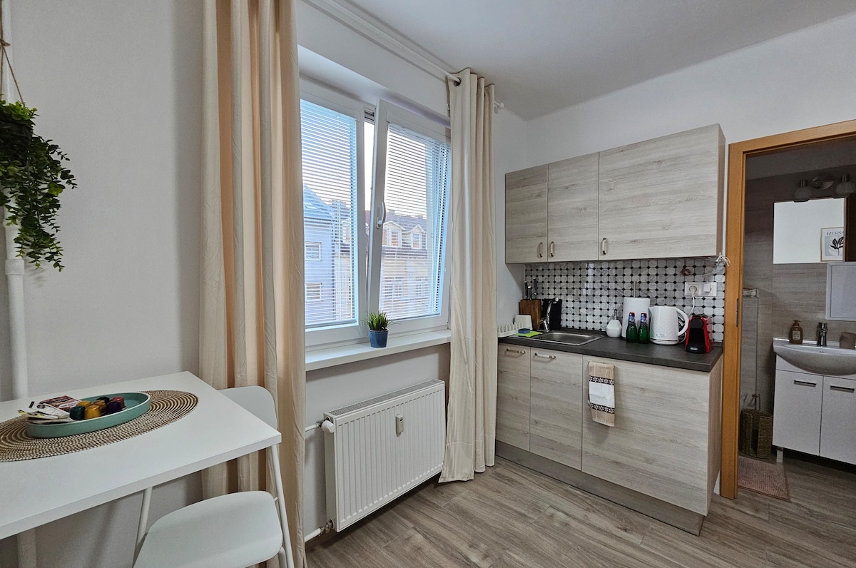 Entdecke unsere gemütliche 1-Zimmer-Wohnung in Bratislava im obersten Stockwerk eines renovierten Gebäudes mit eigenständigem Check-in. Perfekt für zwei Personen, bietet sie vom Balkon aus einen Blick auf die Stadt und liegt abseits der Hauptstraßen, um die Ruhe zu genießen. Genieße eine gut ausgestattete Küche, ein gemütliches Schlafzimmer und ein modernes Badezimmer. Bleibe mit Highspeed-Internet in Verbindung und genieße den Komfort eines nahegelegenen Einkaufszentrums, von Cafés, Wellness und vielem mehr. Mache deinen Aufenthalt in Bratislava unvergesslich – buche noch heute bei uns!