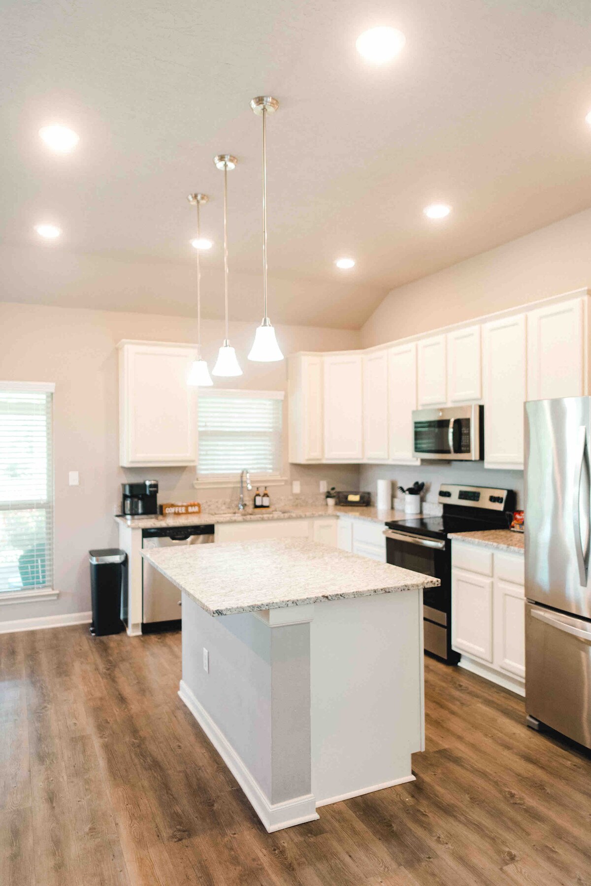 Wunderschönes, maßgeschneidert gebautes Haus mit 4 Betten und 2 Bädern mit viel Platz, um sich mit der Familie oder deiner Gruppe auszubreiten. Die elegante, übergroße Eichen-Haustür öffnet sich in einen großen Wohnraum mit einem 65-Zoll-Flachbildschirm und hohen Decken und viel Platz, um sich auszubreiten. Das Hauptschlafzimmer ist eine echte Präsidentensuite. Riesiger Hof mit 300 Quadratfuß großer, überdachter Terrasse auf der Rückseite mit 60-Zoll-Flachbildschirm und vielen Spielen – Tischtennis, Tischfußball, Darts, Waschmaschinen, Cornhole. Gourmet-Küche, riesiger Wohnbereich mit Ledermöbeln, Kamin und offenem Grundriss.