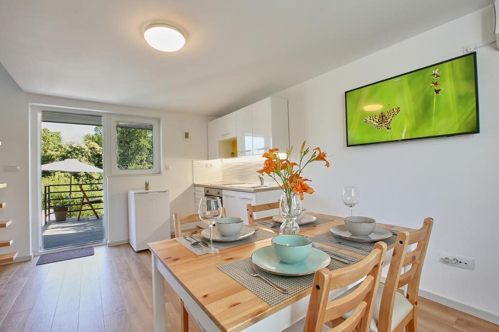 Gemütliches und komfortables Ferienhaus bietet eine moderne und gut ausgestattete Küche. Im Garten gibt es einen Whirlpool, eine Sauna, einen Kamin und einen Grill, wo du Essen zubereiten und die unvergesslichen Sonnenuntergänge genießen kannst. Das charmante Interieur des Ferienhauses ist eine Kombination aus Holz, Glas und Stein. Der Rückzugsort im Ferienhaus Sončni Grič, der von Weingärten, Wald und Warblingvögeln umgeben ist, wird dich mit der Natur und ihren Heilkräften verbinden. Das Sončni Grič befindet sich nur einen Schritt von der Autobahnausfahrt Trebnje East entfernt.