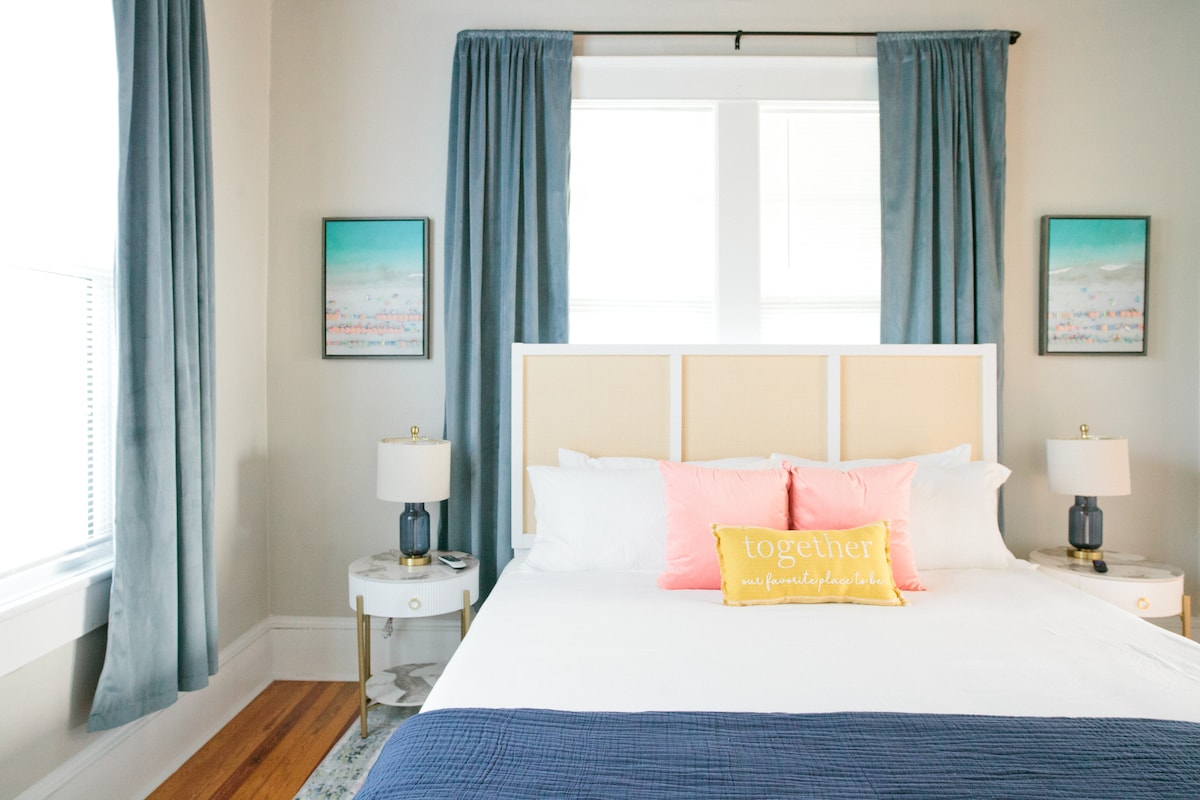 Erkunde die Innenstadt von Pensacola und besuche die erstklassigen weißen Sandstrände von Pensacola von diesem gemütlichen Kutschenhaus aus, das nur wenige Gehminuten von Restaurants, Einkaufsmöglichkeiten, Museen und dem Nachtleben entfernt ist. Steinböden, viel natürliches Licht und hohe Decken. Entspanne dich auf einem privaten Balkon, während du deinen Morgenkaffee nach einer erholsamen Nacht in einem bequemen Bett mit hochwertiger Bettwäsche trinkst. HD-TV und ein kabelloser JBL-Lautsprecher, um deine Musik abzuspielen. Voll ausgestattete Küche mit allem, was du brauchst, um eine Mahlzeit zu kochen. Reichlich Platz im Kleiderschrank für all deine Sachen und eine große Waschmaschine und ein Trockner.