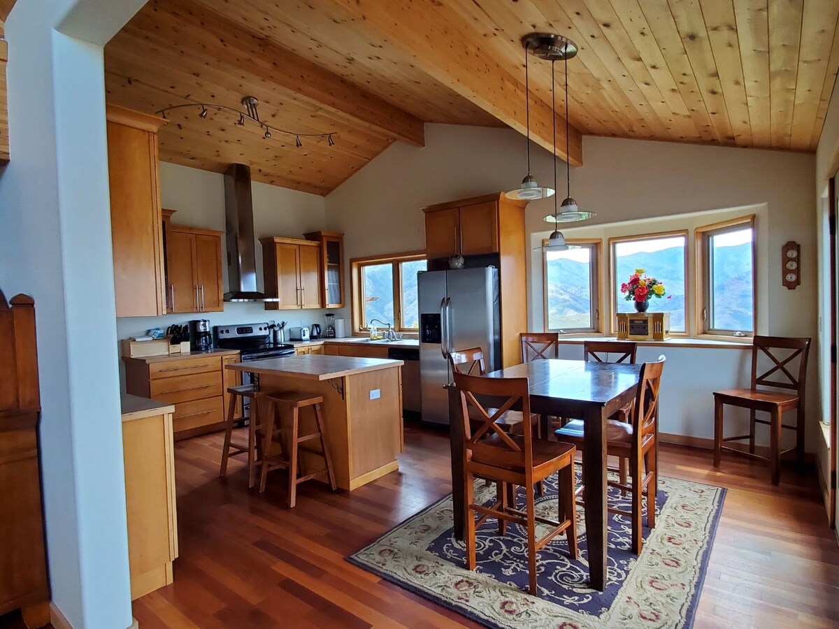 Methow Valley Custom Home, weit über dem Methow River und Columbia Valley. Fast 360-Grad-Blick – nach Westen in die Sawtooth-Berge, nach Norden den Methow River und die North Cascades hinauf und nach Osten zum Columbia River und den östlichen Weizenfeldern. Ihr habt die ganze Unterkunft für euch allein, viel Privatsphäre und Ruhe, auf dem Gipfel der Berge. Wir haben kürzlich die Terrasse auf der Vorderseite auf über 300 Quadratfuß erweitert, mit einem Gasgrill und einem neuen Picknicktisch. Es ist ein toller Ort, um morgens oder abends abzuhängen.