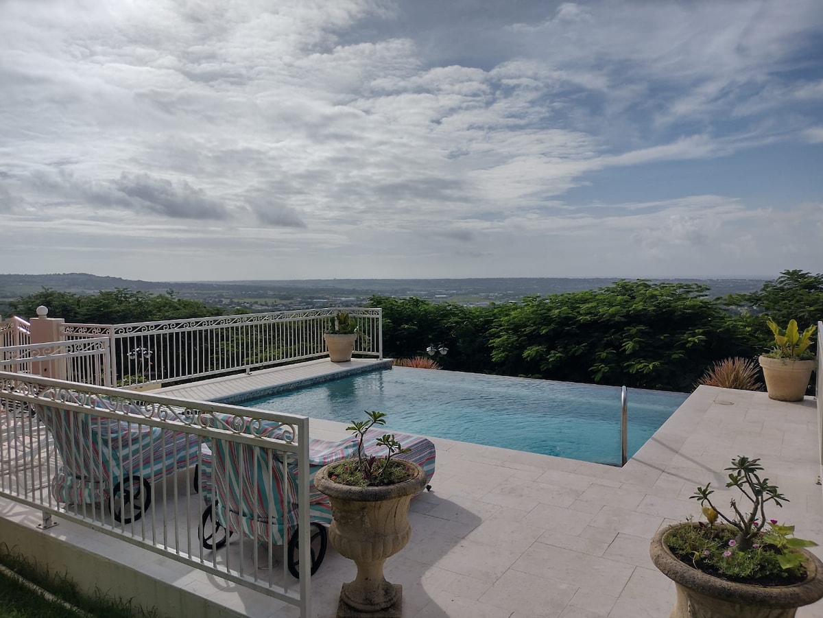 Dieses gemütliche, voll möblierte Ferienhaus mit 2 Schlafzimmern befindet sich neben dem Haupthaus. Es hat einen 180-Grad-Blick mit Blick auf das wunderschöne Barbados. Entfernter Meerblick. Sanfte Brisen vom Hügel halten dich KÜHL. Voll ausgestattete Küche: 1 komplettes Badezimmer: Klimaanlage und Deckenventilator in jedem Schlafzimmer. Vor-Ort-Deck und Pool sind perfekt, um zu entspannen. Shops, Restaurants und lokale Strände sind 5 Fahrminuten entfernt. Das Haupthaus neben dem Ferienhaus kann gleichzeitig von dir oder anderen Gästen gemietet werden.