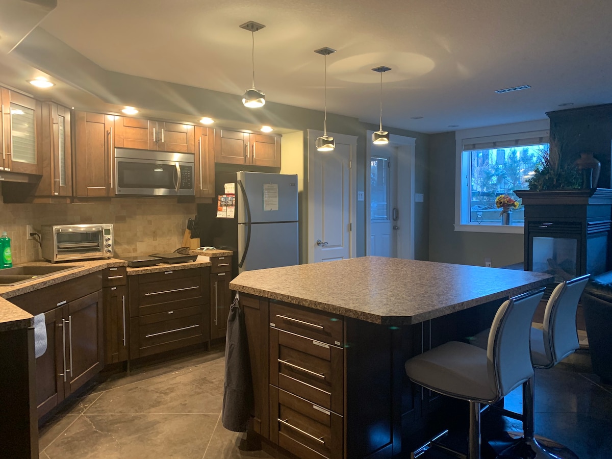 Basement walkout suite is separate from the rest of the home. -yard is shared -small seating area outside -bbq outside -coffee/ tea provided -separate entrance -key code check in -full kitchen -all linens provided -laundry washer/dryer -driveway parking -fireplace -58” TV -wifi -1 queen size bed -1 king size bed