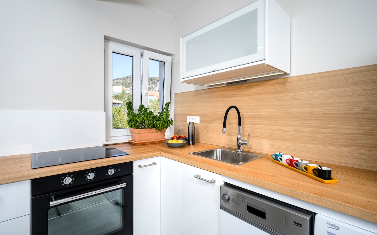 Brandneue moderne und stilvolle Wohnung in zentraler Lage, in Strandnähe und mit einer schönen Aussicht. Diese geräumige (90 m²) moderne Wohnung besteht aus zwei Schlafzimmern, zwei Badezimmern, einer riesigen, offenen Küche mit dem Wohnzimmerbereich und die Terrasse ist komplett für einen sehr komfortablen Aufenthalt ausgestattet. Nur ein paar Gehminuten vom Hauptplatz entfernt, aber trotzdem in einer ruhigen Gegend gelegen.