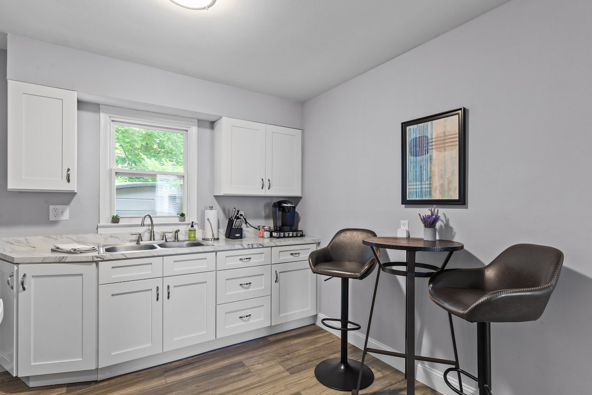 Unser Haus befindet sich in einer sehr ruhigen und sicheren Gegend. Wenn du bei uns übernachtest, kommst du durch den Keller. Du hast vollen Zugang zu unserer sehr privaten Wohnung im Erdgeschoss. Dies führt dich direkt in den sehr großen Wohnbereich. Das Hauptschlafzimmer ist komplett mit einem Kingsize-Bett, Verdunkelungsvorhängen und einem begehbaren Kleiderschrank ausgestattet. Angegliedert ist ein Badezimmer in voller Größe mit ebenerdiger Dusche. Zu den Annehmlichkeiten gehören Fernseher, DVD, WLAN, Kuerig, Minikühlschrank und Zugang zur Terrasse/Veranda mit Feuerstelle im Hinterhof.