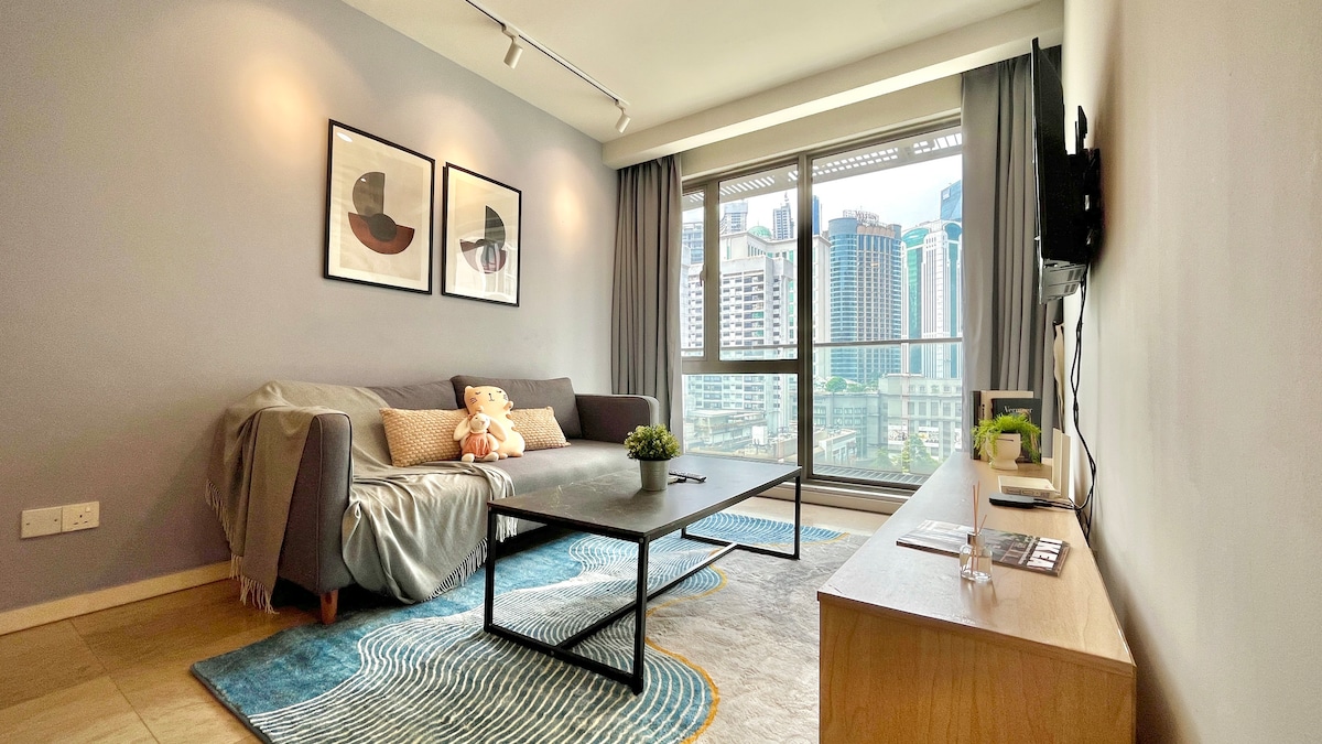 Dieses Apartment mit 1 Schlafzimmer verfügt über einen atemberaubenden Blick auf die Skyline von KL. Sie verfügt über ein 3-Sitzer-Sofa im Wohnzimmer, einen Esstisch, eine Küche, einen Schreibtisch und einen großen Balkon mit Blick auf den KL Tower und die Petronas Twin Towers. Sie verfügt über einen 55-Zoll-Fernseher, Highspeed-WLAN und ein Queensize-Bett, in das du bequem hineinpassen kannst. *Die andere Einheit dieser Dual-Key-Wohnung ist ein kompaktes Studio mit Queensize-Bett, Speisekammer, Waschraum und Bad. Es kann in Freunde passen, die mit dir reisen, mit Privatsphäre. Du kannst gerne nach weiteren Einzelheiten fragen!