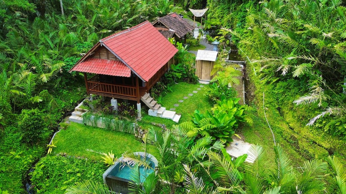 Einzigartiger Aufenthalt mit Balinesen im Dorf. Eigenständige Hütte in der Nähe des balinesischen Hauskomplexes mit Blick auf das Naturtal und den Sonnenaufgang. Entspanne dich bei diesem einzigartigen und ruhigen Kurzurlaub.