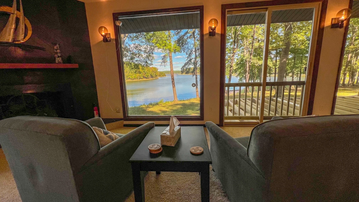 Ruhiger Rückzugsort am See: privater Steg, Tisch und neuer solarbetriebener Sonnenschirm (7/28/25). Zur Ausstattung gehören ein neuer Gasgrill (7/28/25), Paddleboard, Kanu, Kajak, Cornhole, Hängematte, Feuerstelle, Puzzles, Bücher und Spiele. Genieße eine große Terrasse mit zwei Tischen und eine abgeschirmte Veranda mit Couch – perfekt für den Morgenkaffee. Das Haus verfügt über 3 Schlafzimmer, ein Loft, 3 komplette Badezimmer und einen speziellen Arbeitsplatz. Ideal für Familien, Freunde oder Angelausflüge. Die Einfahrt ist für 5 LKWs mit Anhängern geeignet; Bootsanlegeplatz 2 Meilen entfernt.