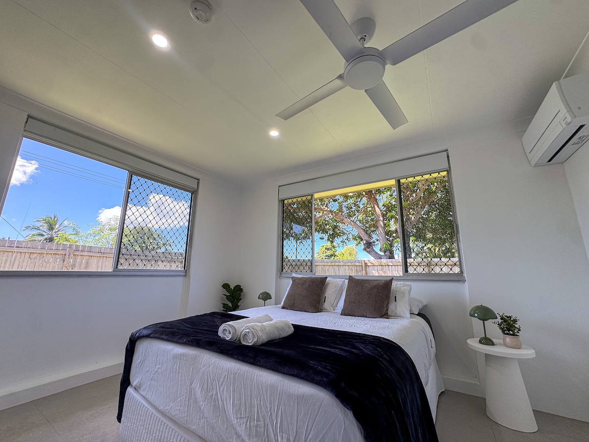 Die Bamboo Villa ist ein privater, klimatisierter, haustierfreundlicher Rückzugsort im Herzen von Edge Hill, Cairns' erstem Vorort, ideal für Berufstätige, Paare oder kleine Familien, die fußläufig haustierfreundliche Cafés und grüne Straßen suchen. Gegenüber dem Botanischen Garten, nur wenige Gehminuten von Restaurants, Cafés und Lebensmittelgeschäften entfernt. 5 Minuten vom Flughafen und dem Stadtzentrum entfernt. Unsere Unterkunft verfügt über alle Annehmlichkeiten, die du brauchst. Mit einem eingezäunten vorderen Bereich und einem sicheren Hinterhof