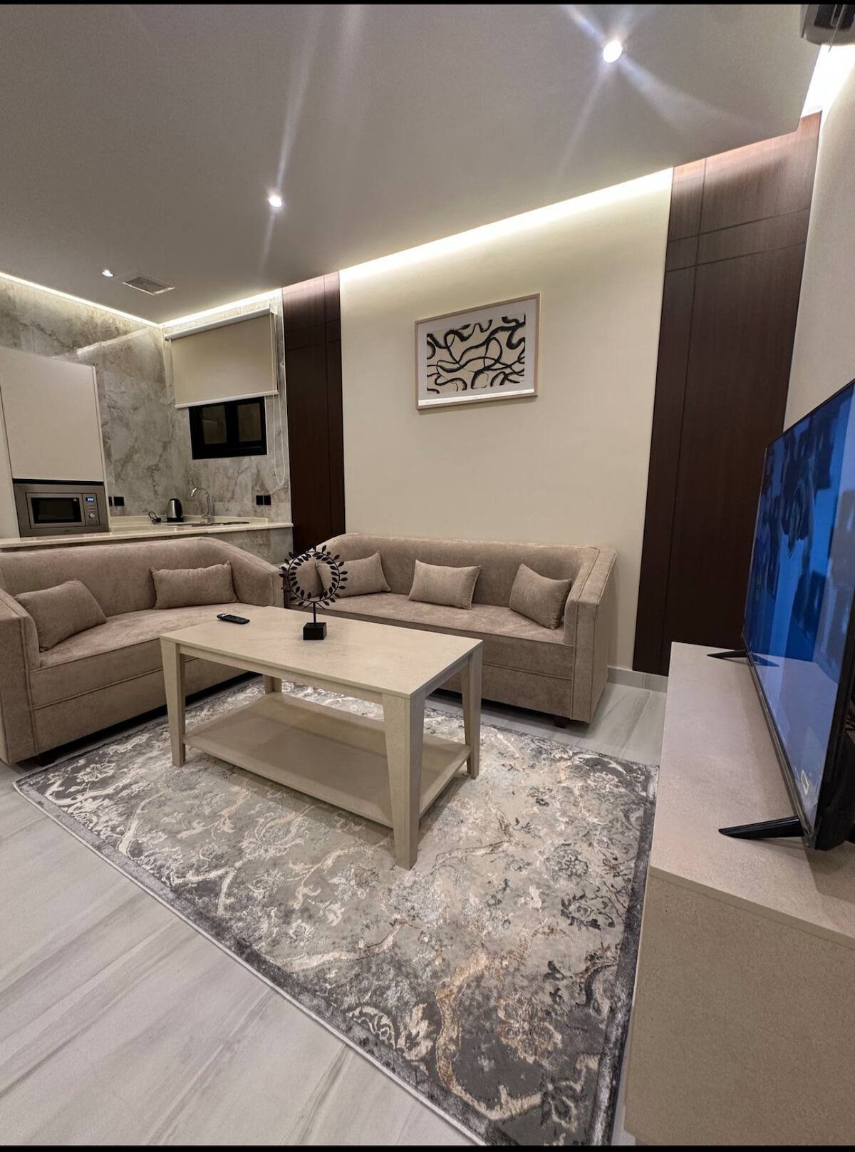 Eine High-End-Wohnung in bester Lage im Viertel Al-Fayziyah in Qassim, nur 20 Minuten vom Flughafen und 5 Minuten von der Al-Nakheel Mall entfernt und in der Nähe aller Dienstleistungen, Restaurants und Geschäfte. Die Wohnung verfügt über ein modernes Design und eine elegante Dekoration, darunter ein privates Schlafzimmer und ein geräumiges Wohnzimmer mit bequemen Möbeln und einem großen Fernseher. Schnelles WLAN, ein privater Parkplatz und ein luxuriöser 5-Sterne-Hoteleingang stehen zur Verfügung. Es gibt auch eine kleine Küche, um Kaffee und Snacks zuzubereiten, mit einer bequemen Sitzgelegenheit und warmer Beleuchtung. Die perfekte Wahl für kurze oder lange Aufenthalte, die Komfort, Privatsphäre und die perfekte Lage kombiniert.