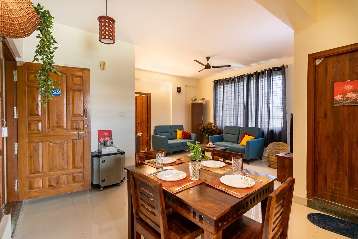 Willkommen in meiner voll möblierten und komfortablen 1BHK-Wohnung in North Bangalore, perfekt für bis zu 4 Gäste. Das Schlafzimmer verfügt über ein Doppelbett und das Wohnzimmer über ein Schlafsofa, einen LED-TV, einen USV-Wechselrichter und stilvolle Urban-Ladder-Möbel. Die Küche verfügt über einen LG-Kühlschrank, Toaster, Induktionskochfeld und alle notwendigen Utensilien. Der Grundpreis gilt für 2 Gäste, mit zusätzlichen Gebühren für mehr Gäste (bis zu 4). Dieses gemütliche und erschwingliche 1BHK bietet Komfort, Stil und Bequemlichkeit ohne die Luxushotel-Extras.