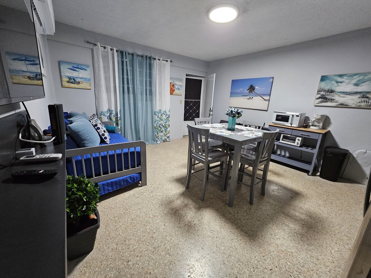 Private, geräumige Wohnung in einem Gebäude mit kontrolliertem Zugang. 1 Schlafzimmer und 1 Badezimmer, Wohnung möbliert und dekoriert, damit du dich wie zu Hause fühlst. WLAN und ein Fernseher mit Roku sind verfügbar, sodass du im Urlaub Filme streamen oder auf deine E-Mails zugreifen kannst. Komfortable, nach vorne gerichtete Terrasse. Es gibt eine gemeinsam genutzte Waschküche auf dem Grundstück mit einer gewerblichen Waschmaschine und einem Trockner, die gegen eine kleine Gebühr genutzt werden können. Zentral gelegen in Aguadilla, etwa 10 Fahrminuten von Einkaufszentren, Parks und Stränden entfernt.
