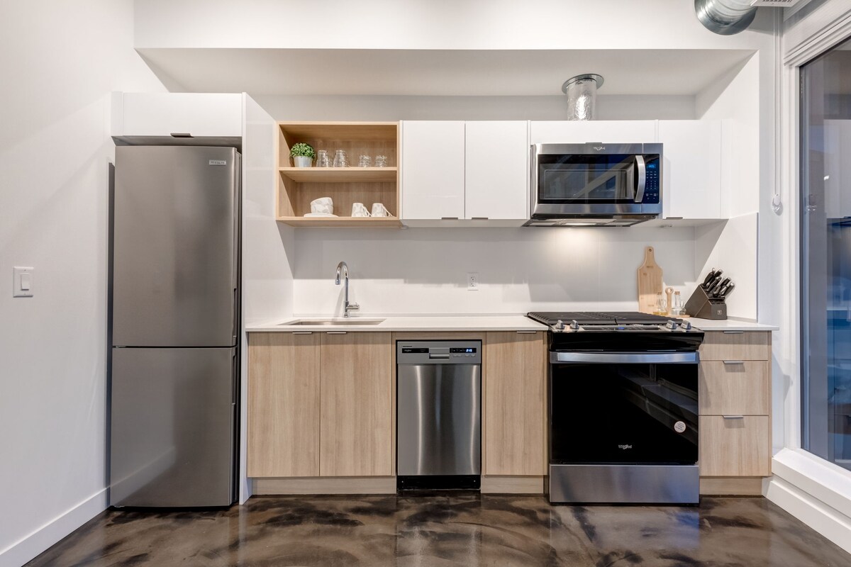 - Geräumige 1-Zimmer-Wohnung mit hohen Decken - Kingsize-Bett mit vielen Kissen - 55-Zoll-Fernseher mit Apple Play - schnelles WLAN - Voll ausgestattete Küche - Tiefgarage - Wunderschöne Aussicht auf die Skyline von Calgary. - In Inglewood findest du lokale Brauereien, Cafés, Top-Restaurants, Livemusik und Einkaufsmöglichkeiten - Der Bow River, nur wenige Schritte von deiner Tür entfernt! - Nur wenige Gehminuten vom Stampede-Gelände entfernt - Beobachte das Feuerwerk von der Terrasse aus