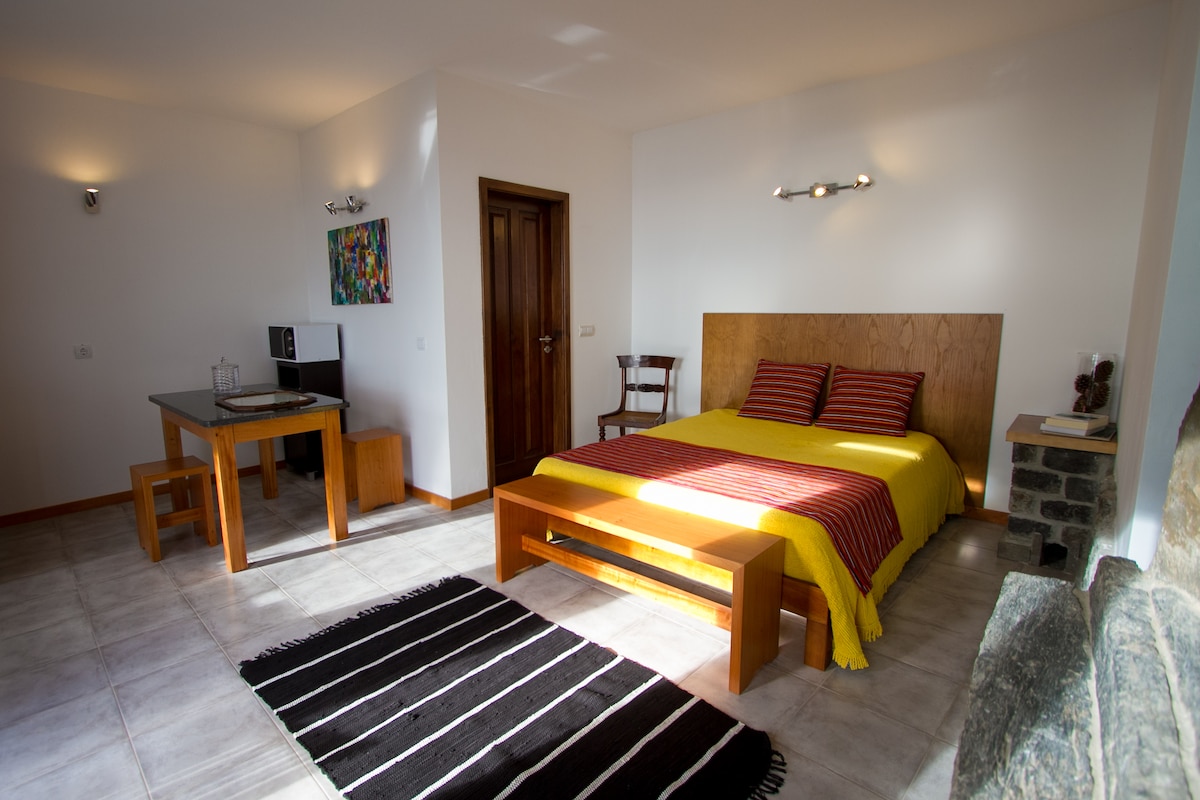 Dies ist ein AL (lokale Unterkunft) Studio, mit ca. 36 m², modern, integriert in ein hundertjähriges Steinhaus – bezeichnet Casa Mãe – mit einem herrlichen Blick auf den Atlantik. Die Gäste haben Zugang zu einem schönen Garten mit Gras und einheimischen/endemischen Pflanzen sowie zu einem kleinen Garten mit tropischen Früchten. Du wirst herrliche Sonnenuntergänge genießen und die Klänge der Natur hören – Vögel, Frösche und Schmetterlinge in einigen Jahreszeiten.