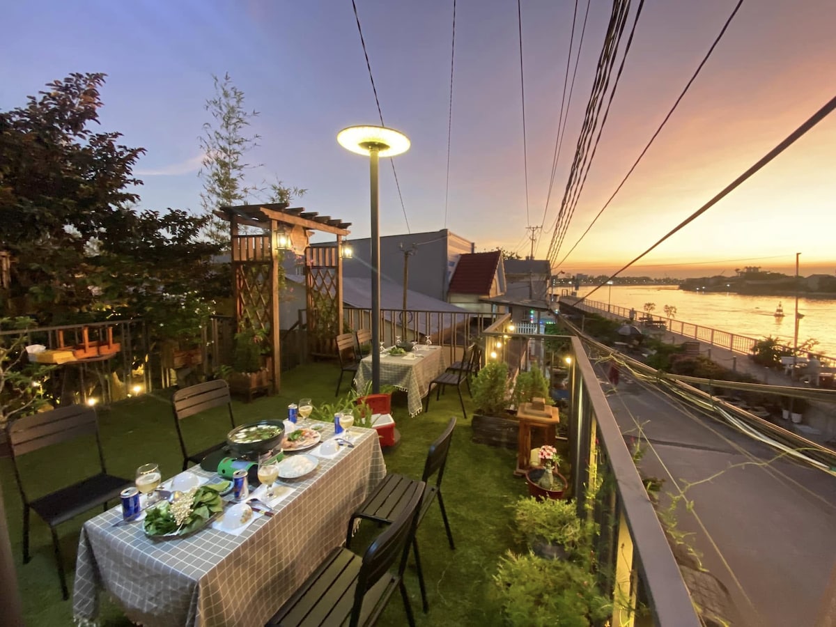 Mit einer Baufläche von 300 m² und einem Grundstück von 1.000 m² direkt neben dem schönen Flussufer. Die Villa ist in einem offenen Stil gestaltet, wodurch ein Gefühl des Eintauchens in die Natur entsteht, und vom Wohnzimmer der Villa aus kann man einen Blick auf die Uferpromenade haben, um die Schiffe aller Größen vorbeiziehen zu sehen, was ein sehr großartiges Gefühl vermittelt. Ab dem 1. August 2025 haben wir das Hinzufügen von DOME-Zelten auf der Dachterrasse der Villa abgeschlossen und dies wird ein beispielloses Erlebnis sein, wenn Sie ins Mekong-Delta kommen.