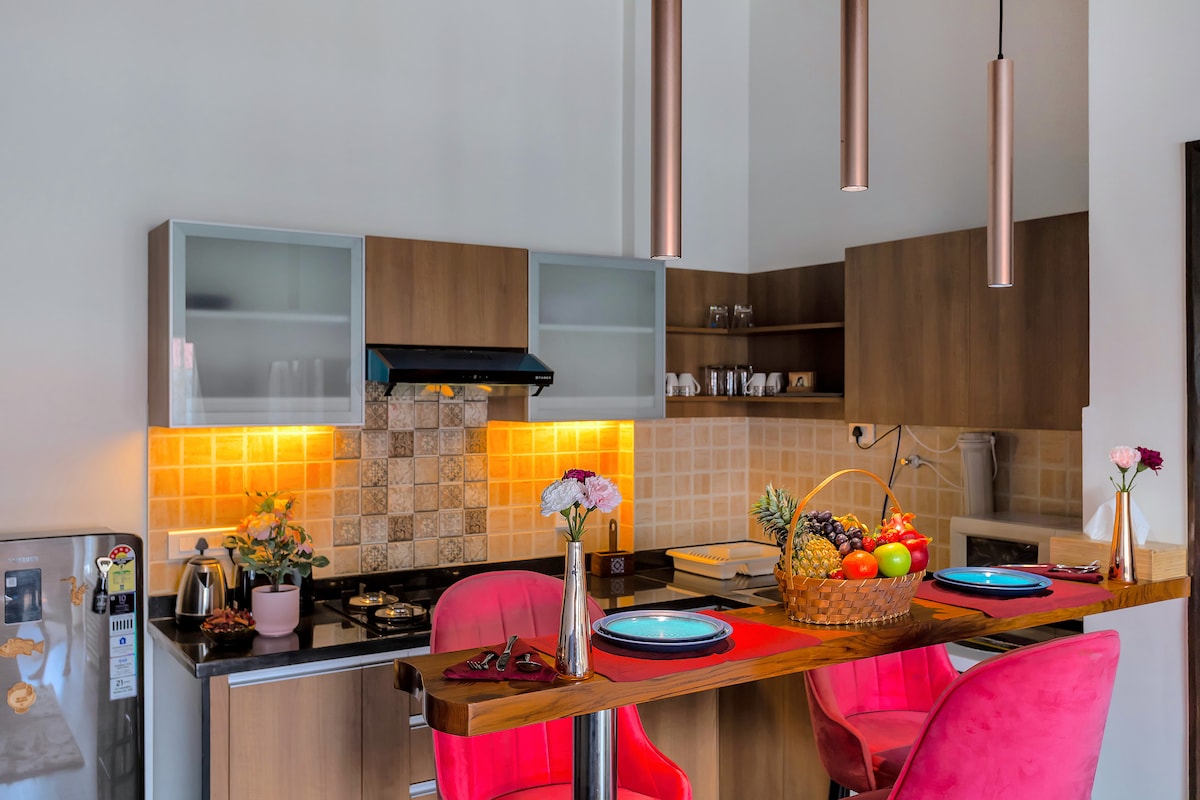 Moderne Boho-Wohnung | Minuten von den Stränden von North Goa entfernt. Ein gemütliches, voll möbliertes 1BHK-Retreat im Erdgeschoss, perfekt für Paare, Freunde oder kleine Familien. Die Highlights: - Stilvolle Boho-Innenräume mit einer warmen Atmosphäre - Klimaanlage im Schlafzimmer und Wohnzimmer für Komfort - Smart-TV + Highspeed-WLAN - Ausgestattete Küche mit RO-Wasser, Herd, Kühlschrank und Waschmaschine - Gemeinsamer Swimmingpool (9:00 Uhr - 18:00 Uhr | Badebekleidung obligatorisch - Fitnessraum vor Ort für 200 INR pro Person und Tag verfügbar - 24 Stunden Sicherheitsdienst. - Parken ist kostenfrei