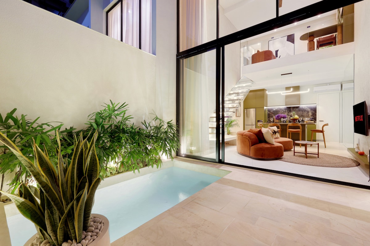 *Nur Erwachsene* Nicht für Kinder geeignet Auf zwei luxuriösen Ebenen mit modernem, zeitgenössischem Design ist die Einzigartigkeit des Lofts unübertroffen. Mit Elementen aus Beton und üppigen honigfarbenen Holzmerkmalen gibt es ein absolutes Gefühl von Wärme und Opulenz im Inneren. Die untere Ebene ermöglicht es dir, die weitläufigen, raumhohen Schiebetüren zu öffnen, wodurch der nahtlose Übergang vom Hauptwohnbereich entsteht und der abgeschiedene tropische Innenhof und der Pool eins werden.