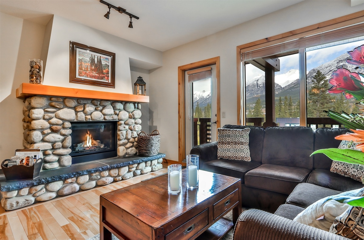 Willkommen im Luxusurlaub im Herzen von Canmore! Luxuriöse Penthouse-Einheit mit atemberaubendem Bergblick! - Dieses luxuriöse und aktualisierte mehrstöckige Penthouse ist eine nach Süden ausgerichtete Eckeinheit mit spektakulärem Blick auf die Natur. Hochwertige Möbel im Holzstil haben das moderne Ferienhaus geschaffen, nach dem du gesucht hast. Das Fitnesscenter und der romantische Whirlpool auf der Dachterrasse mit 360-Grad-Bow Valley-Blick befinden sich nur wenige Schritte entfernt.