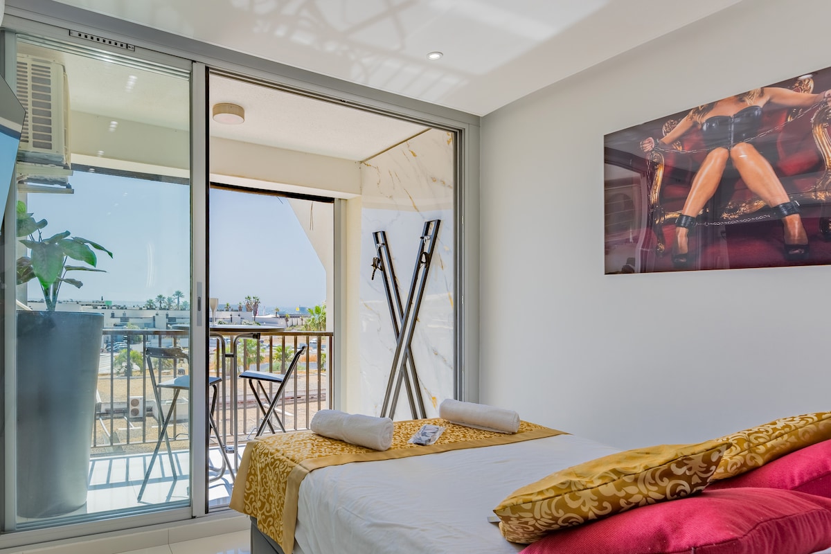 Im FKK-Dorf, in Heliopolis GH, 2. Stock, sehr schöne 2 Zimmer von 31 m2 klimatisiert. WLAN, privater Parkplatz. 1 separates Schlafzimmer (160 cm Bett mit Deckenspiegel) mit BDSM-Ecke auf der Loggia mit Meerblick. 1 großes Wohnzimmer mit 1 Terrasse mit Meerblick. 1 Badezimmer. 1 separate Toilette. 1 voll ausgestattete Küche (Backofen, Herd, Mikrowelle, Kühlschrank). Bettwäsche wird zur Verfügung gestellt. Helle LED. Ideal gelegen am Fuße der Geschäfte, des Glamour Beach und des Strandes.