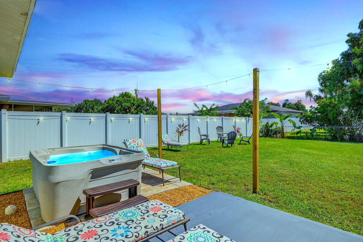 Escape to this stylish mid-century modern cozy retreat in SE Cape Coral! Recently renovated with modern decor, this colorful getaway offers fast WiFi, coffee & tea, bikes & beach gear, 65” TV plus smart TVs in every bedroom, ready to stream & chill. Relax in the 4-person hot tub, unwind at the outdoor bar with TV, 7 enjoy one of the comfy lounge chairs. Perfect for couples or families, this home blends comfort & design for an unforgettable stay near beaches, dining & downtown entertainment.
