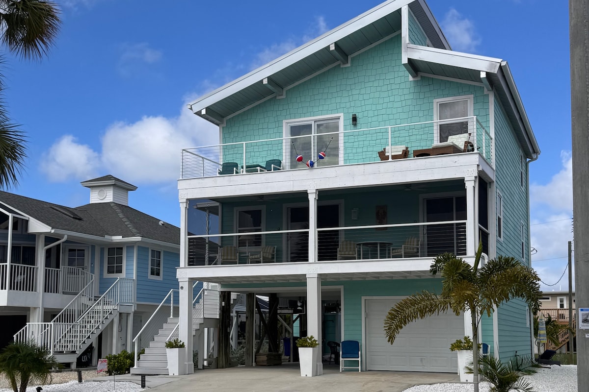 Personally hosted by Paul & Alicia of Dancing Palms Vacations, a fresh coastal escape with all the essentials: a saltwater heated pool, fenced backyard, and spacious lanai for lounging or dining outdoors. The covered front porch frames bay views and catches Gulf breezes — perfect for slow mornings with coffee. After the beach (just a short walk away), fire up the Blackstone grill or wander to local restaurants and bars. (FMB permit/license 25-0052)