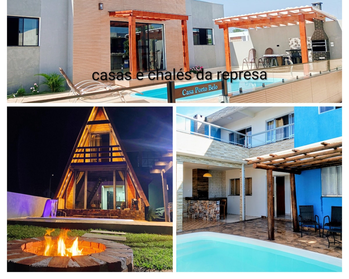 Neues Haus, ruhig, in einer Wohnanlage, mit eigenem Parkplatz, 200 m vom Staudamm von Chavantes entfernt, mit großen Räumen, voll ausgestatteter Küche, Schwimmbad, großem Garten mit Pergola und Volleyballnetz, Grillplatz mit Holztisch für 12 Personen, überdachtem Grill und horizontalem Gefrierschrank, Blick auf den Staudamm im Obergeschoss. Perfekt zum Ausruhen und Genießen der schönen Landschaft der Region. Haus mit besonderer Sorgfalt für besondere Momente mit Familie und Freunden.