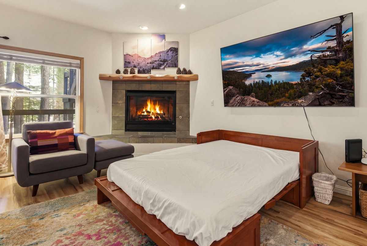 WSTR21-0081 TLT: W-4729 Willkommen im Heart of the Lake, einer gemütlichen 1-Zimmer-Wohnung, die perfekt für einen ruhigen Winterurlaub ist. Entspanne dich im Kingsize-Bett, wärme dich am Kamin auf oder genieße deinen Morgenkaffee auf der privaten Terrasse mit Waldblick. Gäste haben Zugang zum ganzjährig geöffneten Whirlpool, zur Sauna und zum Fitnessraum. Mit einer voll ausgestatteten Küche, einem Smart-TV und einer ruhigen Lage in der Nähe von Restaurants, Geschäften und nahe gelegenen Skigebieten ist dies ein idealer Ausgangspunkt für einen erholsamen Winteraufenthalt in Tahoe. Parkplätze außerhalb der Straße sind nicht erlaubt.